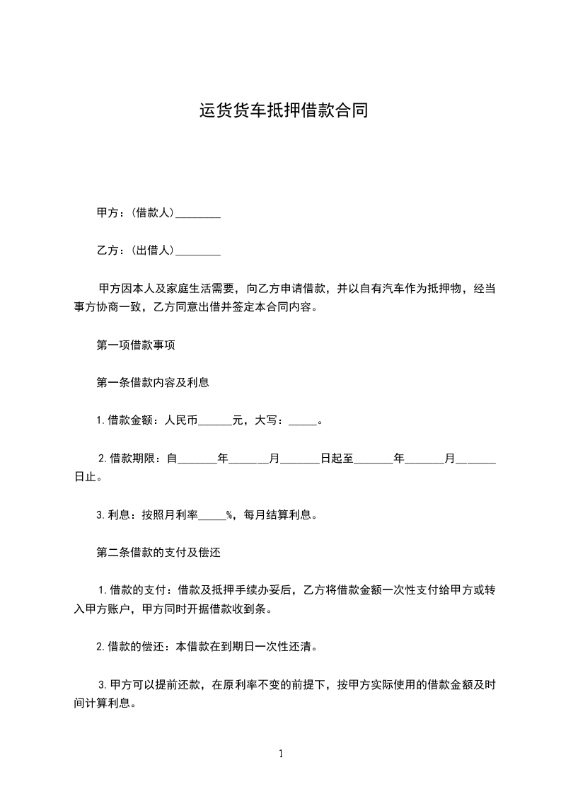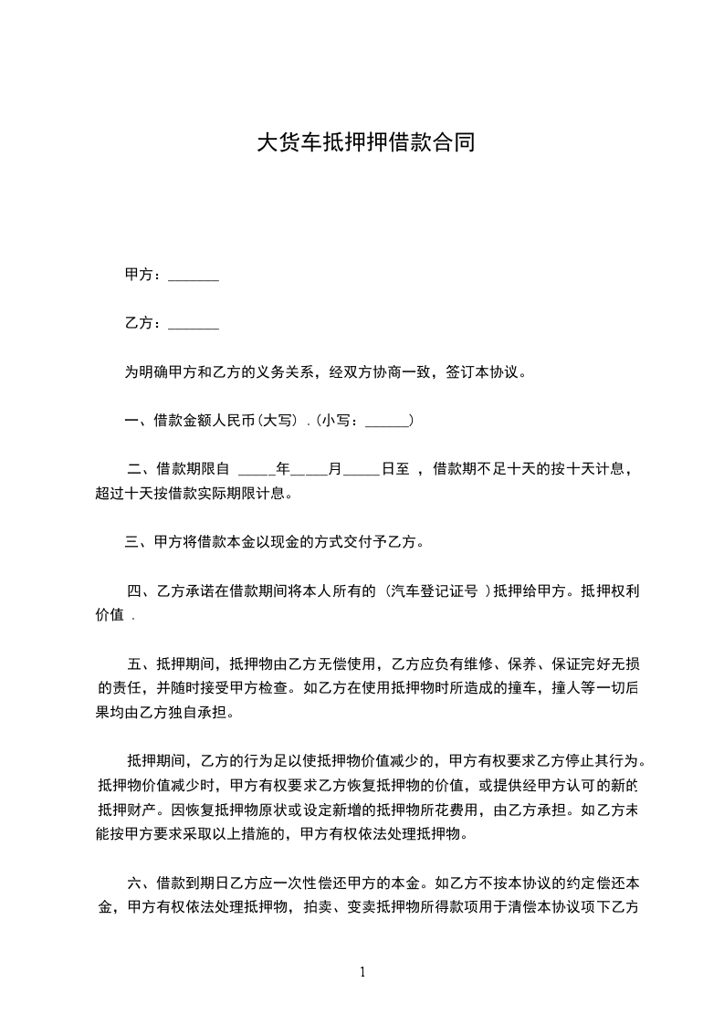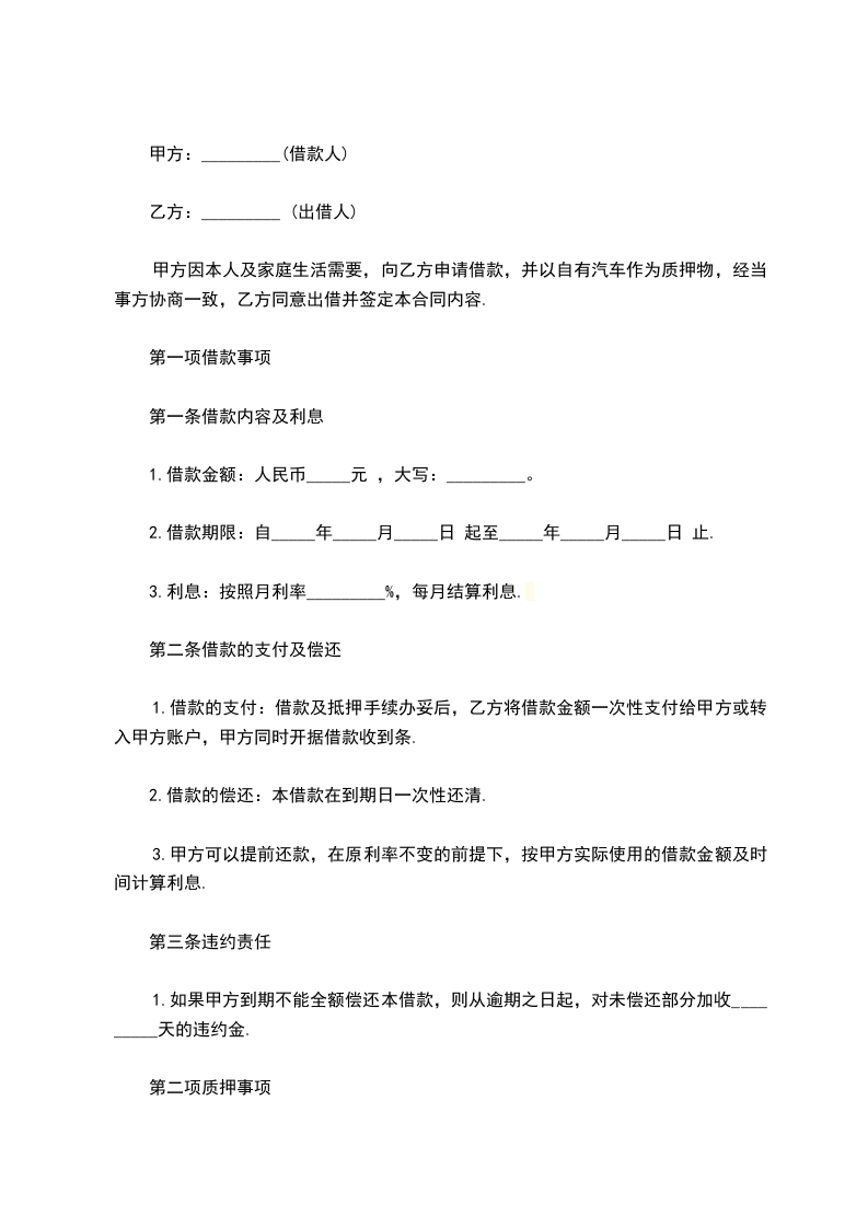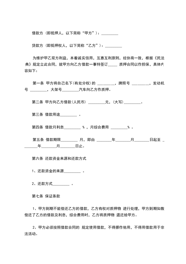 第一条 甲方将自己名下(有处分权)的 _________,牌照号 _________,发动机号 _________,大架号_________汽车向乙方作质押。