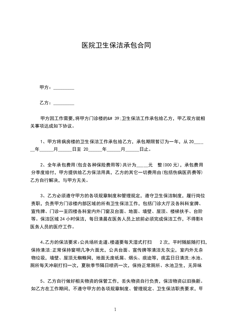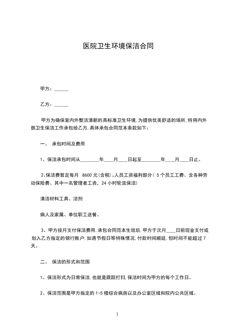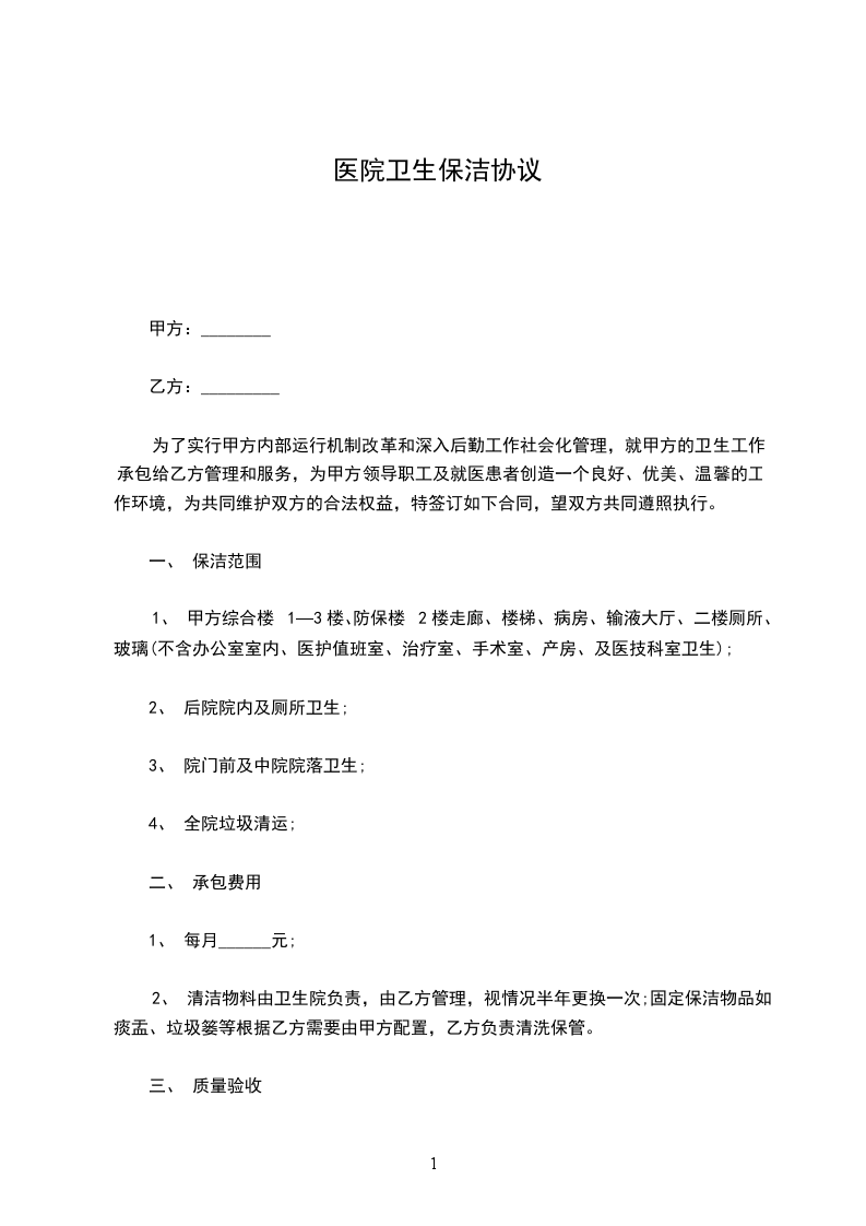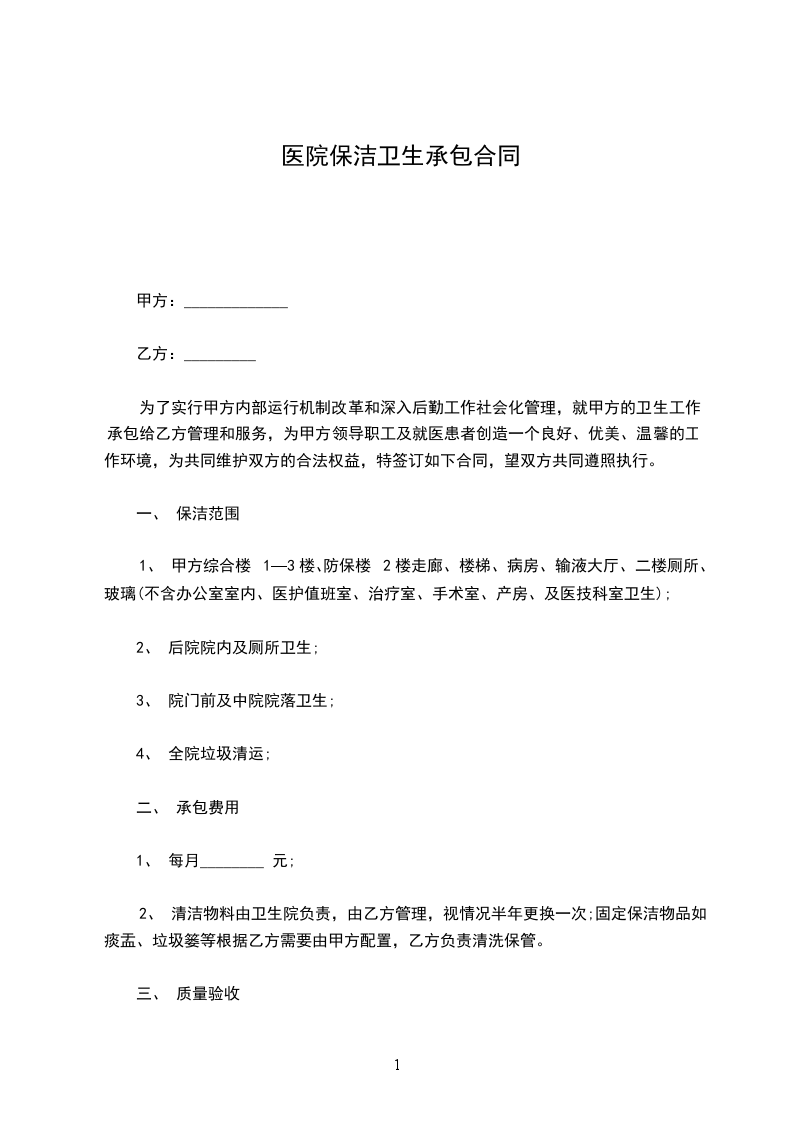为了实行甲方内部运行机制改革和深入后勤工作社会化管理,就甲方的卫生工作承包给乙方管理和服务,为甲方领导职工及就医患者创造一个良好、优美、温馨的工作环境,为共同维护双方的合法权益,特签订如下合同,望双方共同遵照执行。