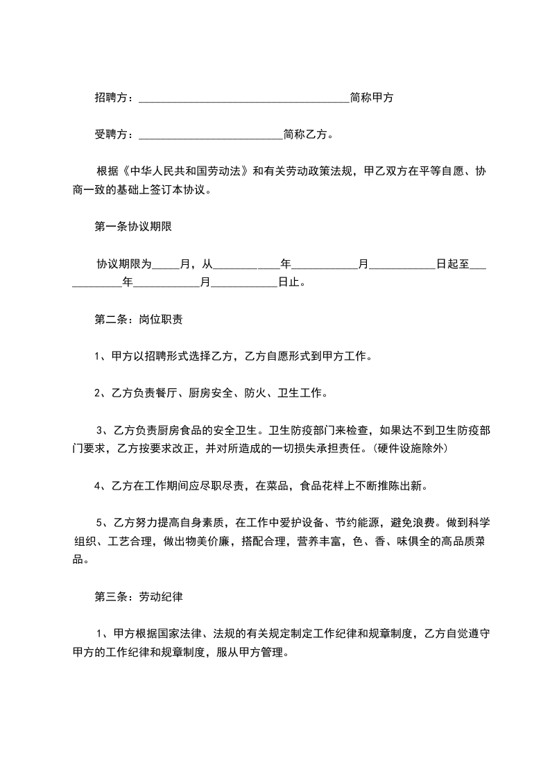 第二条 乙方担任 食堂厨工岗位(工种)工作。