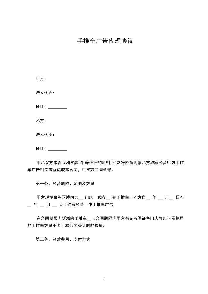 甲方现在东莞区域内共__ 门店,现存__ 辆手推车,乙方自__ 年 __ 月__ 日至 __ 年 __ 月 __ 日止独家经营上述手推车广告。