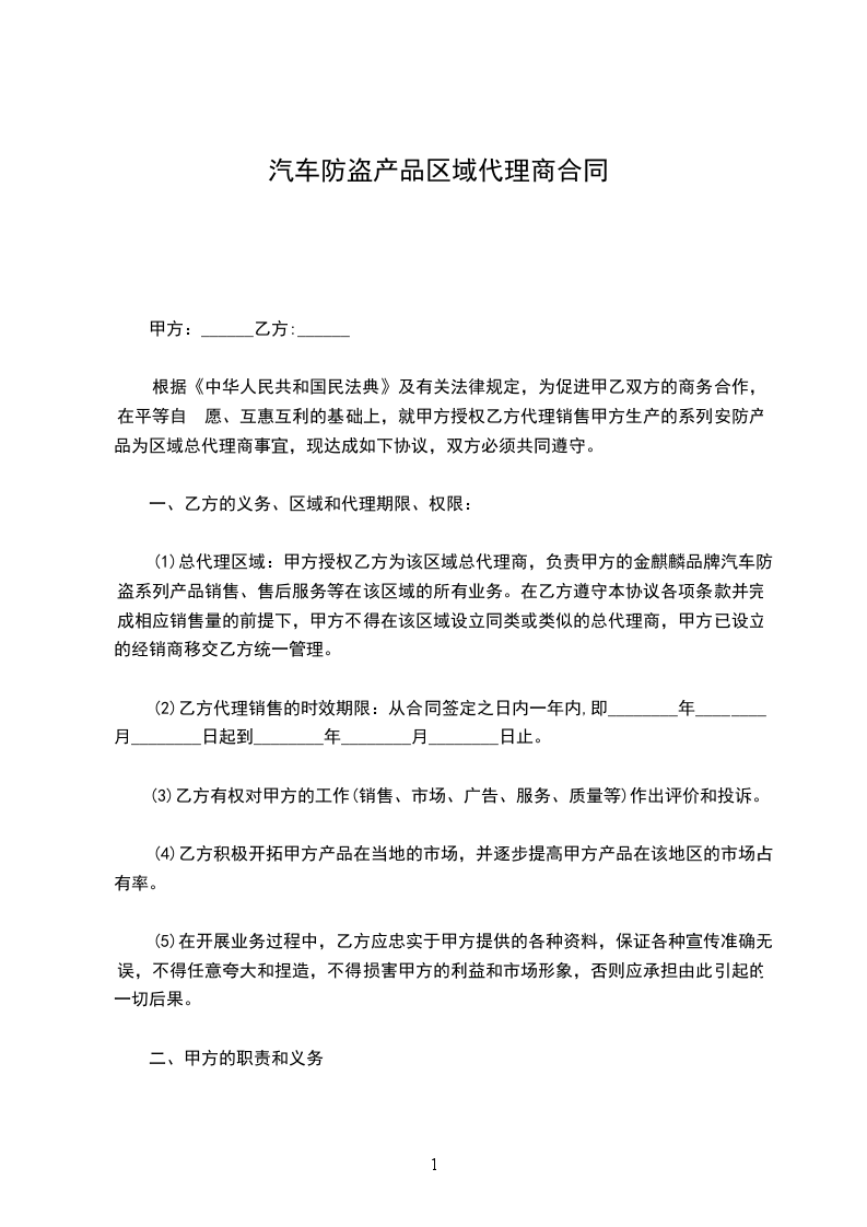 1.2 乙方的代理区域为__________________地区。甲方授权乙方为以上_______个区域总经销的权限,全面负责_______个区域的销售和经销商管理。如因乙方串货行为造成甲方或者甲方的其他代理商经济损失的,甲方有权追索乙方的违约责任。双方约定每台车违约金为_________元,同时,甲方应明令禁止其他区域的授权经销商在上述_______个区域销售(该市场_______年______月______日以前的供货车辆除外),否则视同甲方违约。
