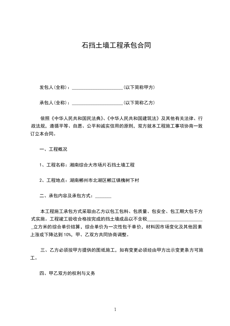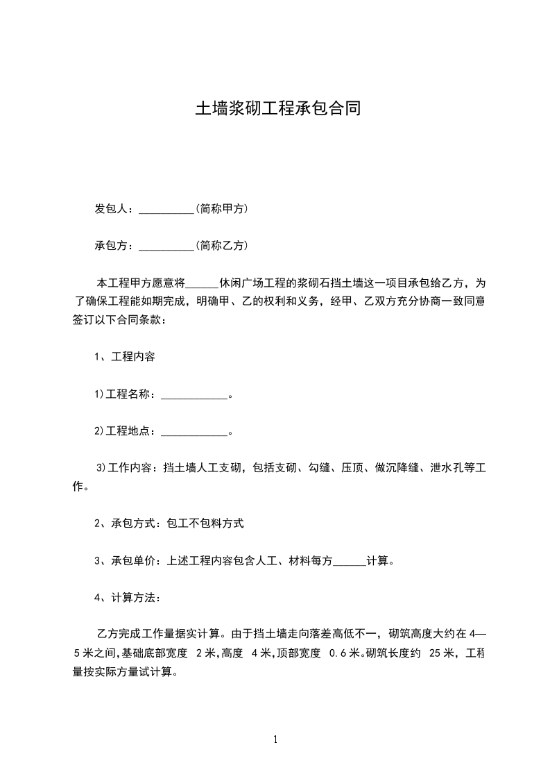 本工程甲方愿意将______休闲广场工程的浆砌石挡土墙这一项目承包给乙方,为了确保工程能如期完成,明确甲、乙的权利和义务,经甲、乙双方充分协商一致同意签订以下合同条款: