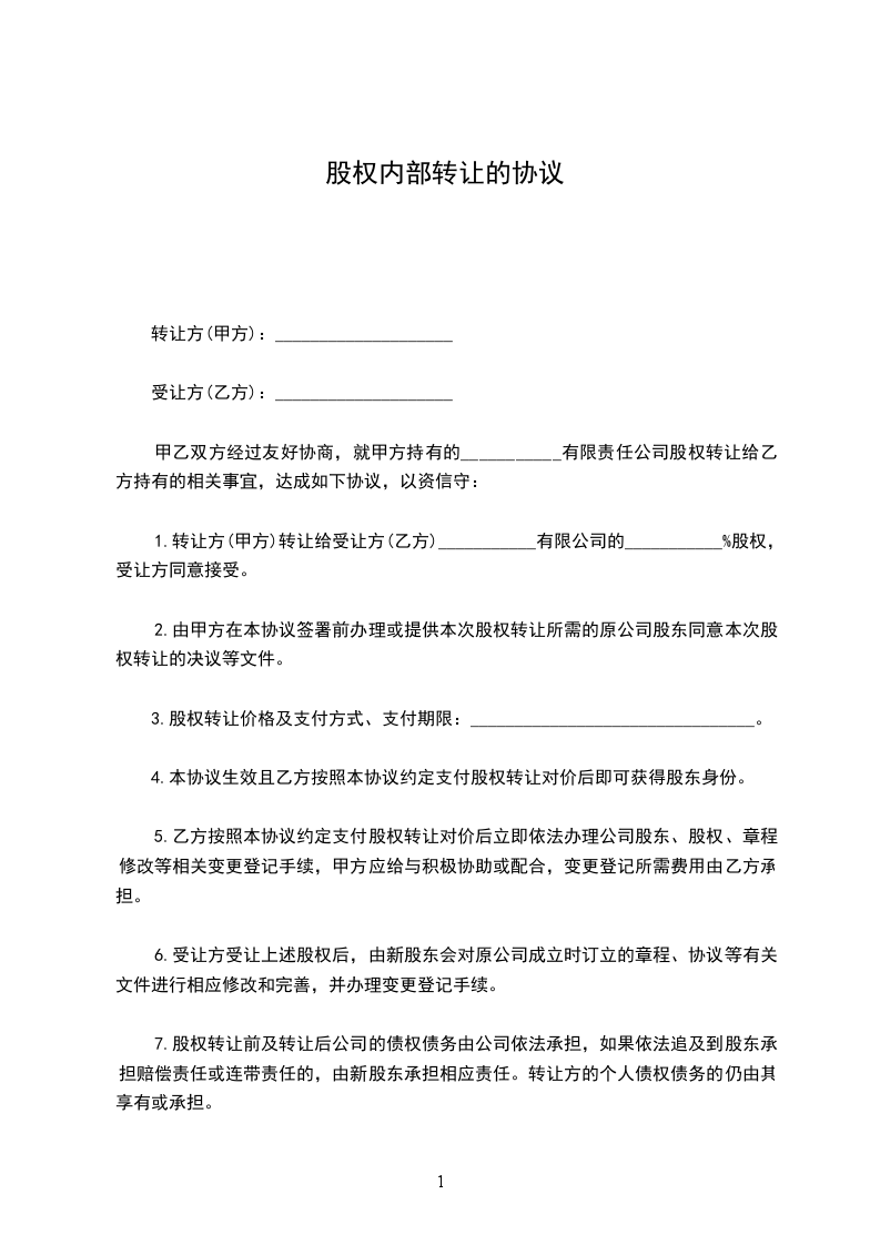 1.原股东_________将其在公司的全部股权,折人民币_________,占注册资本_________%转让给股东_________。