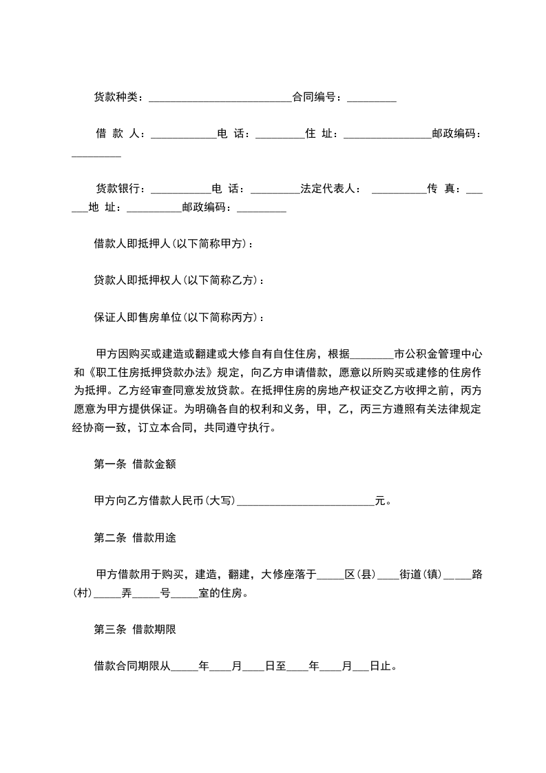 甲方因购买或建造或翻建或大修自有自住住房,根据________市公积金管理中心和《职工住房抵押贷款办法》规定,向乙方申请借款,愿意以所购买或建修的住房作为抵押。乙方经审查同意发放贷款。在抵押住房的房地产权证交乙方收押之前,丙方愿意为甲方提供保证。为明确各自的权利和义务,甲,乙,丙三方遵照有关法律规定,经协商一致,订立本合同,共同遵守执行。
