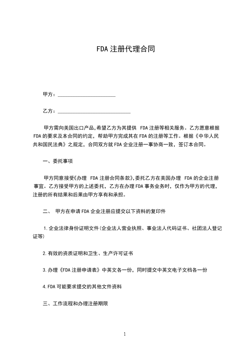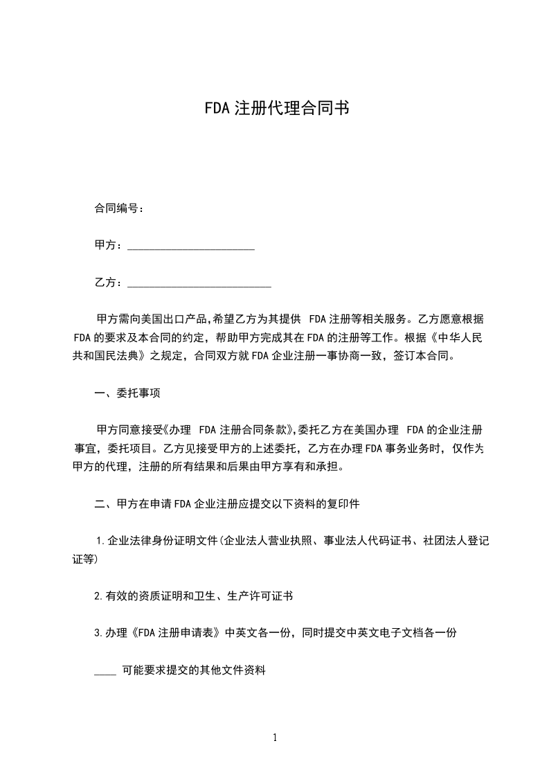 甲方同意接受《办理FDA注册合同条款》,委托乙方在美国办理FDA的企业注册事宜。乙方接受甲方的上述委托,乙方在办理FDA事务业务时,仅作为甲方的代理,注册的所有结果和后果由甲方享有和承担。