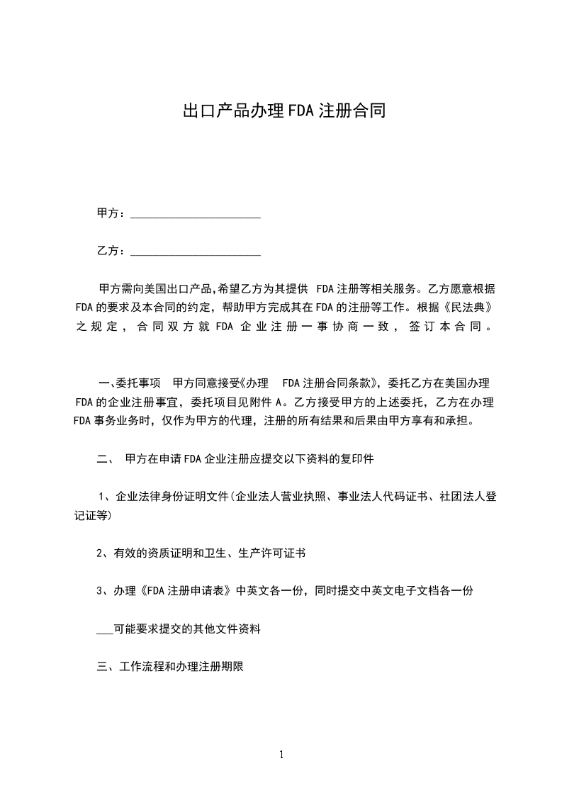 甲方需向美国出口产品,希望乙方为其提供FDA注册等相关服务。乙方愿意根据FDA的要求及本合同的约定,帮助甲方完成其在FDA的注册等工作。根据《中华人民共和国民法典》之规定,合同双方就FDA企业注册一事协商一致,签订本合同。