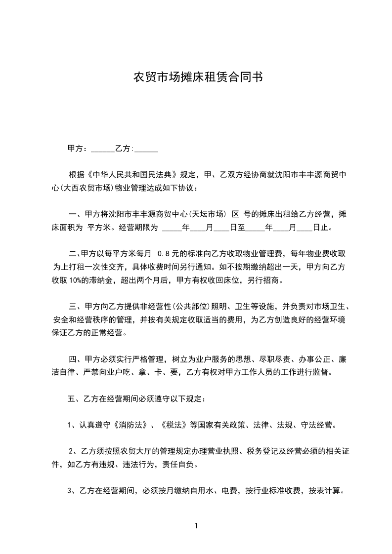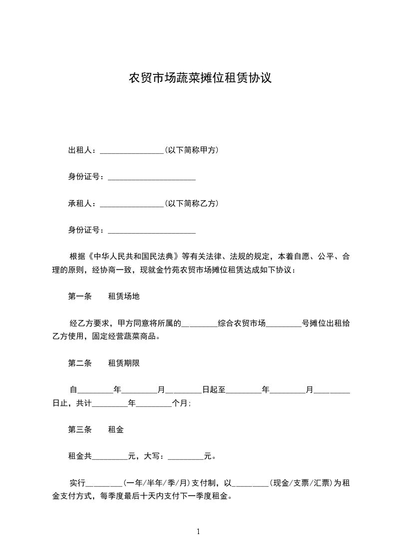 根据《中华人民共和国民法典》等有关法律、法规的规定,本着自愿、公平、合理的原则,经协商一致,现就金竹苑农贸市场摊位租赁达成如下协议:
