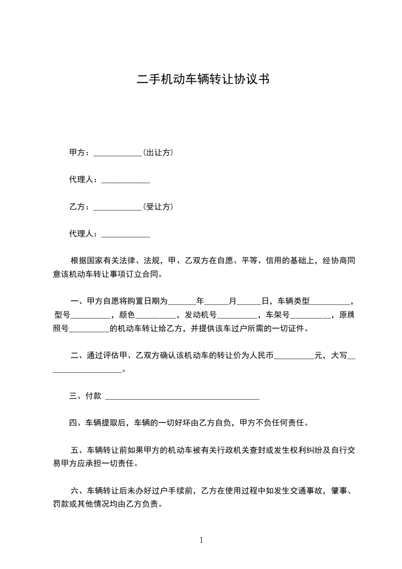 一、甲方自愿将购置日期为_______年______月______日,车辆类型__________,型号__________,颜色__________,发动机号__________,车架号__________,原牌照号__________的机动车转让给乙方,并提供该车过户所需的一切证件。