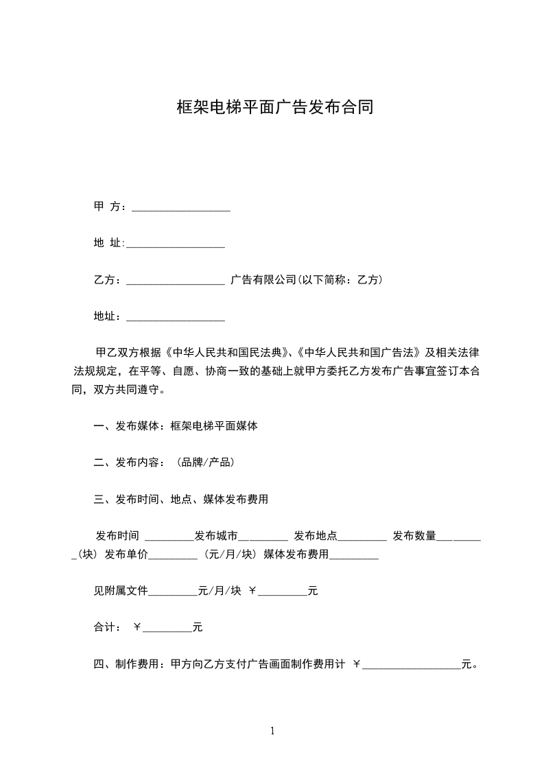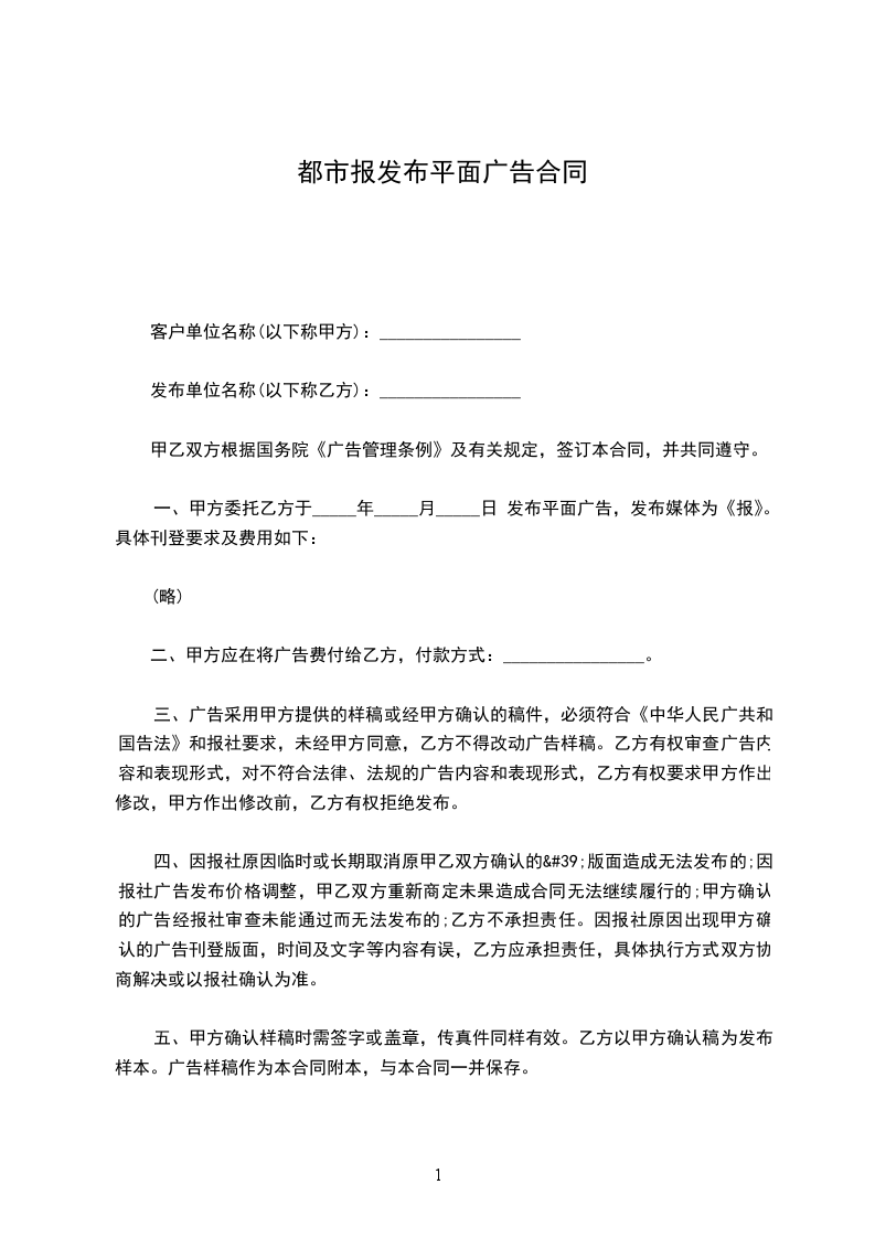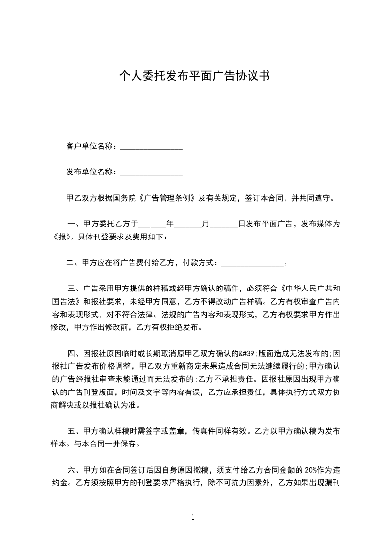 一、甲方委托乙方于_____年_____月_____日 发布平面广告,发布媒体为《________报》。具体刊登要求及费用如下:________。