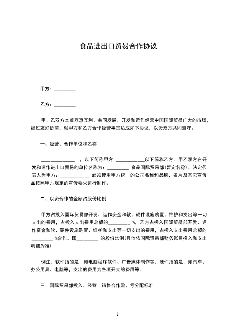 ______________ ,以下简称甲方,____________以下简称乙方。甲乙双方在开发和运作进出口贸易的单位名称为:_________ 食品国际贸易部(暂定名称),法定代表人为甲方:____________,必须使用甲方统一的公司名称和品牌,名片及其它宣传品按照甲方规定的宣传要求进行制作。