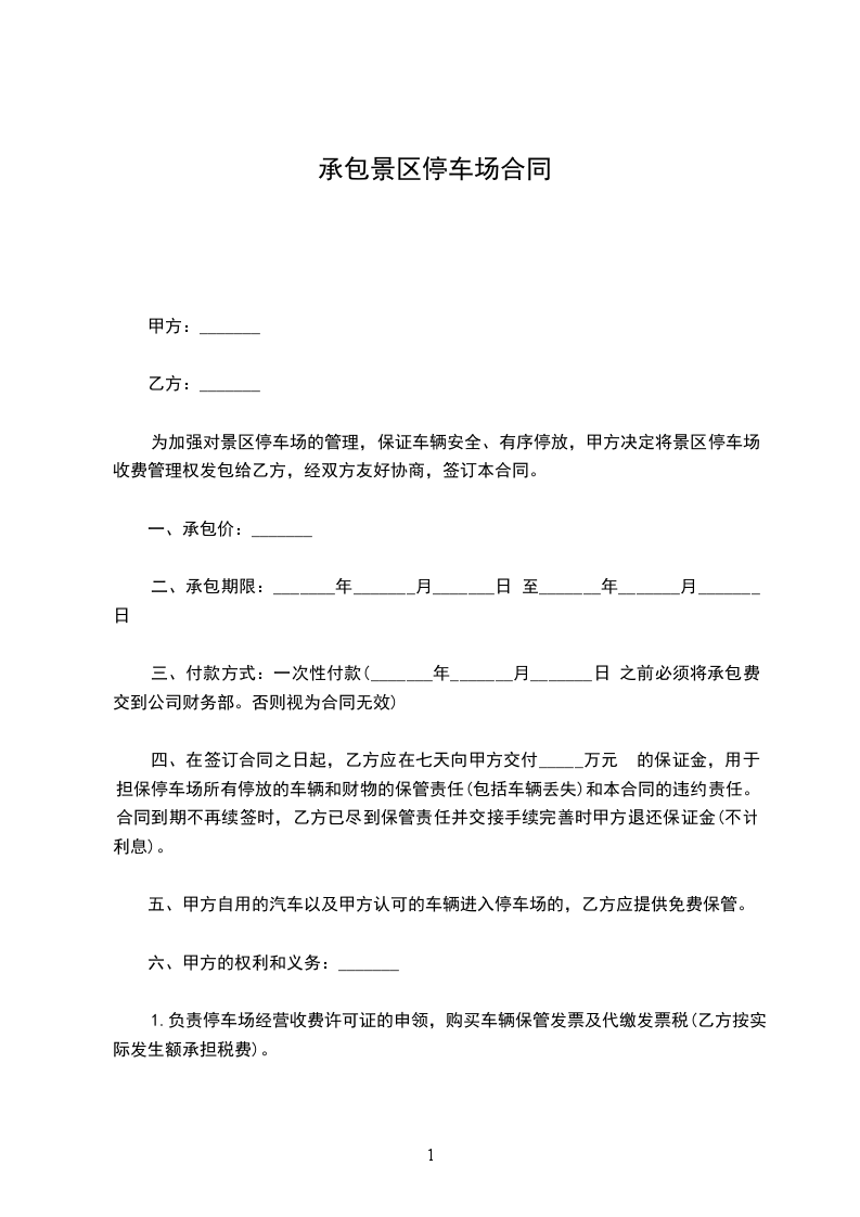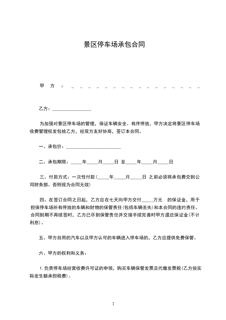 为加强对景区停车场的管理,保证车辆安全、有序停放,甲方决定将景区停车场收费管理权发包给乙方,经双方友好协商,签订本合同。