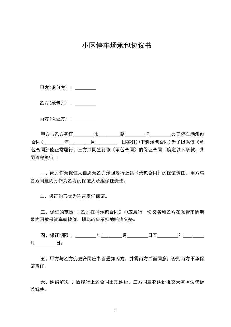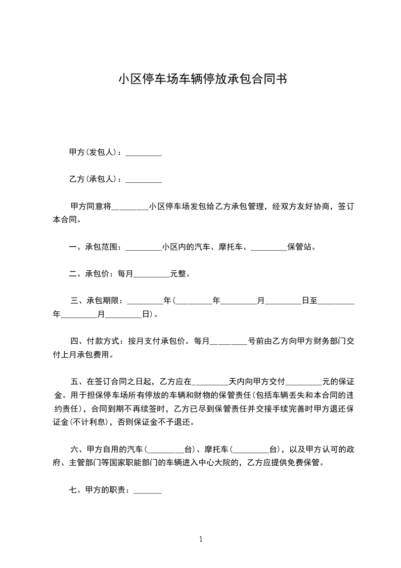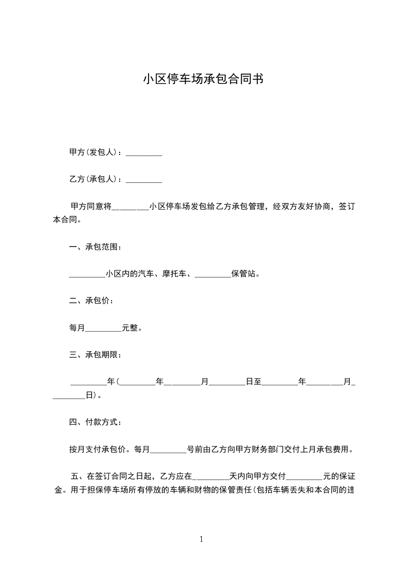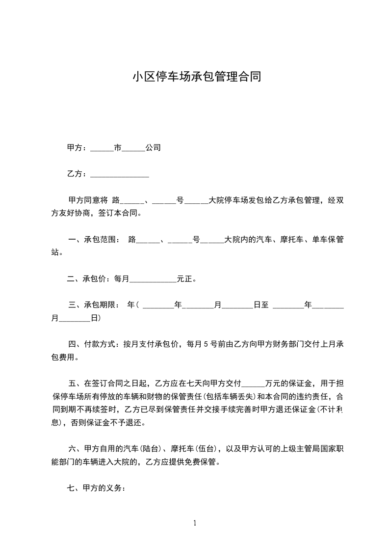 四、在签订合同之日起,乙方应在七天向甲方交付_____万元 的保证金,用于担保停车场所有停放的车辆和财物的保管责任(包括车辆丢失)和本合同的违约责任。合同到期不再续签时,乙方已尽到保管责任并交接手续完善时甲方退还保证金(不计利息)。