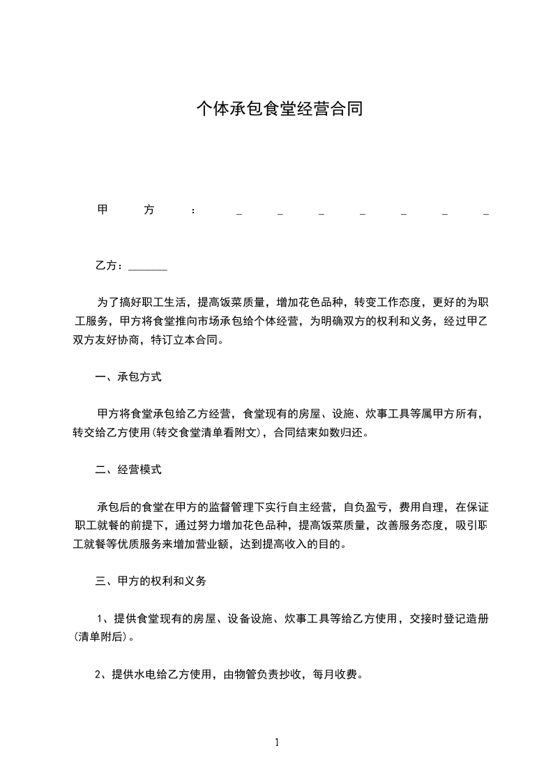 1 、甲方提供厨房、餐厅、全套厨房设备,负责水电和燃料及厨工住宿。