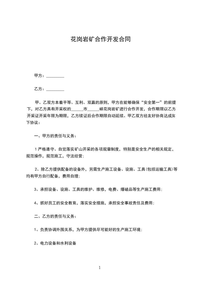 甲、乙双方本着平等、互利、双赢的原则,甲方在能够确保“安全第一”的前提下,对乙方具有开采权的______市______峡花岗岩矿进行合作开发,合作期限以乙方开采证开采年限为期限,乙方续证后合作期限自动延续。甲乙双方经友好协商达成如下协议: