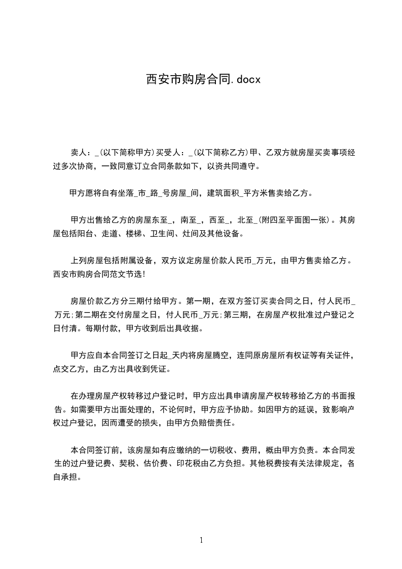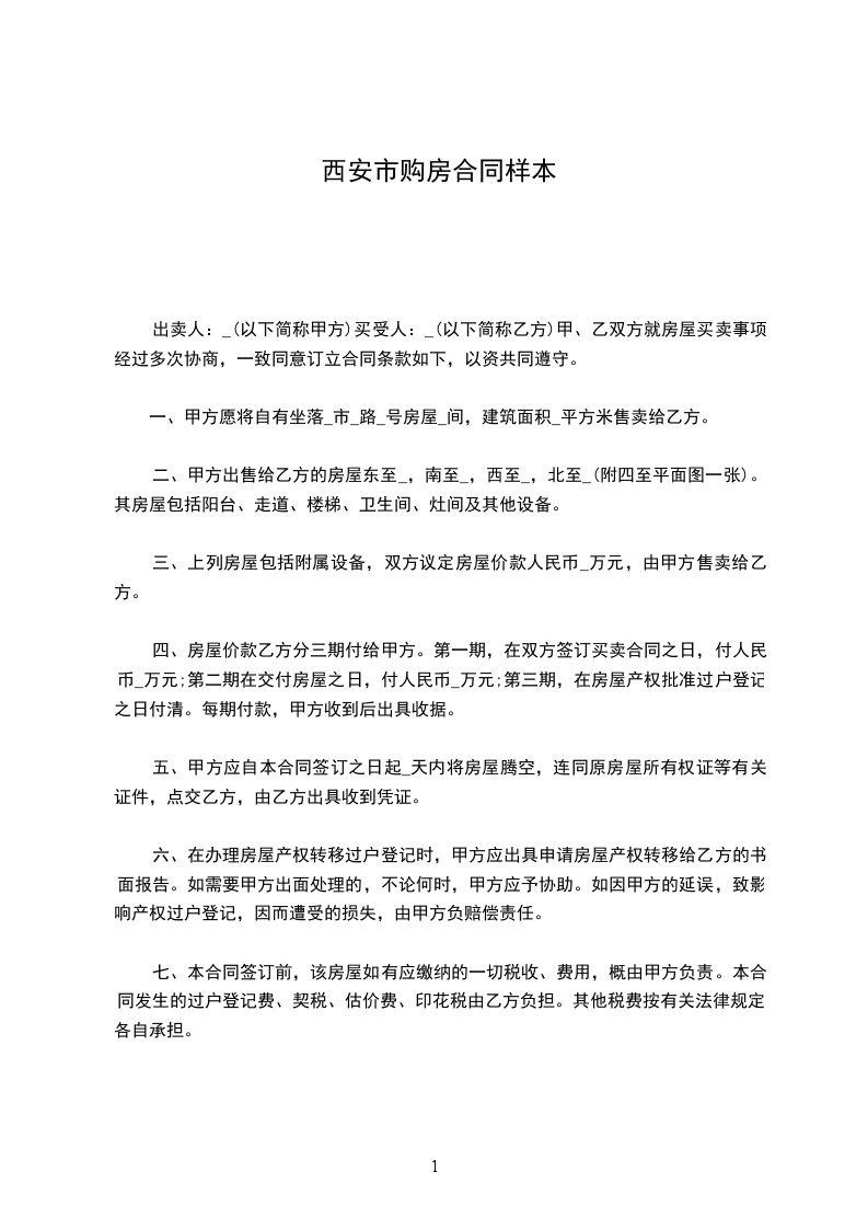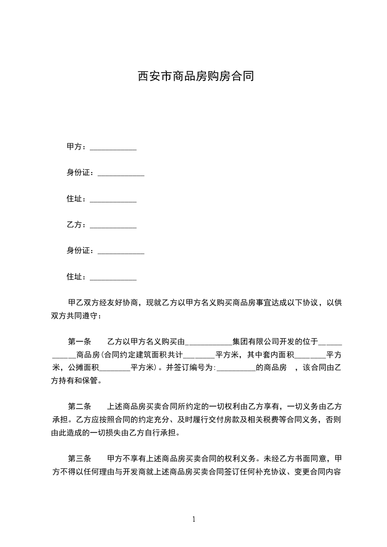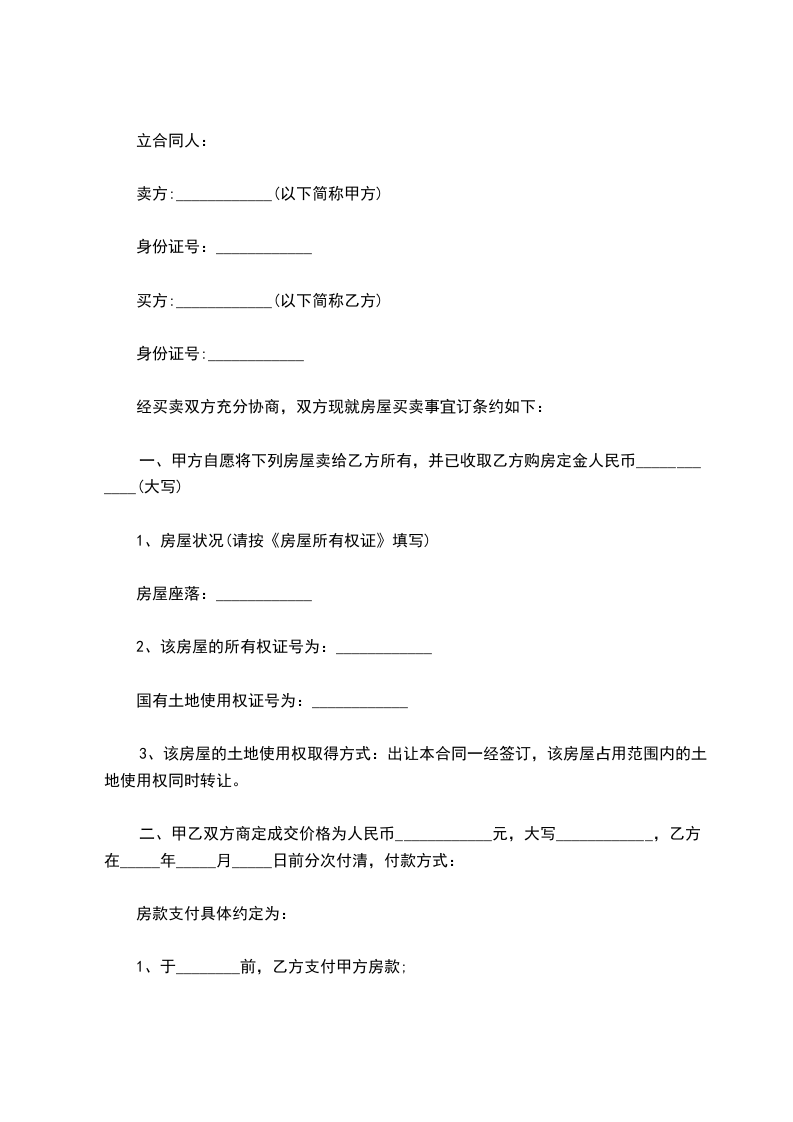 1、乙方于_________年_______月______日与甲方签订购房合同时,交定金(大写)____拾___万___仟___佰___拾___元整(小写:¥______元)。