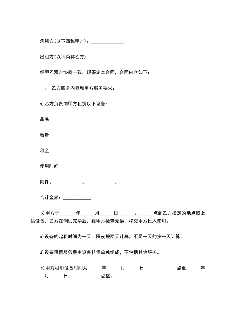 一、租赁设备:_________(如所需设备较多,乙方所列设备清单为合同的有效附属文件)。电源、场地等请甲方准备。