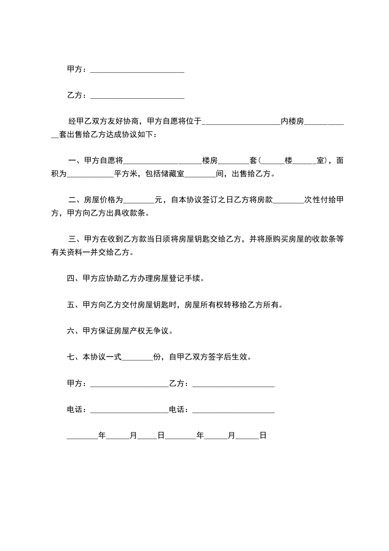 一、甲方自愿将____________________楼房________套(______楼______室),面积为____________平方米,包括储藏室________间,出售给乙方。