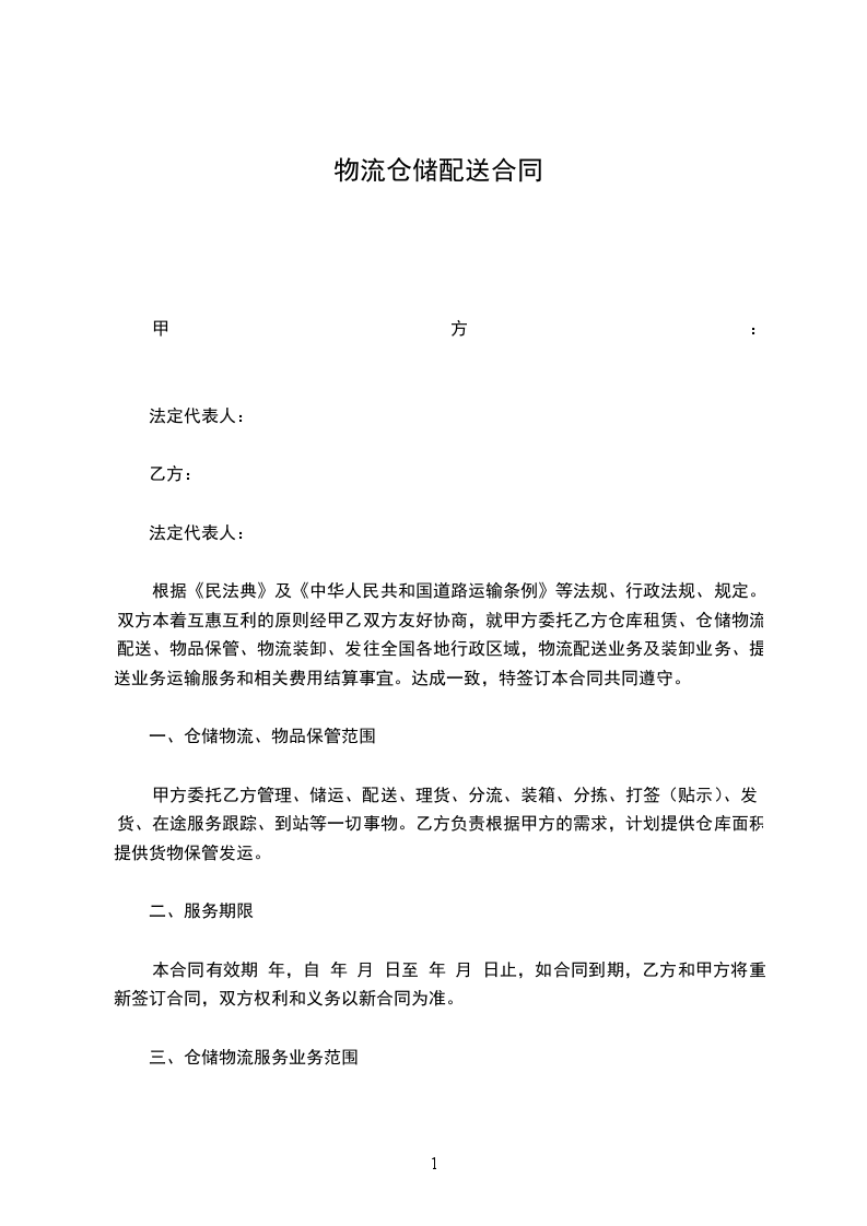 根据《民法典》及《中华人民共和国道路运输条例》等法规、行政法规、规定。双方本着互惠互利的原则经甲乙双方友好协商,就甲方委托乙方仓库租赁、仓储物流配送、物品保管、物流装卸、发往全国各地行政区域,物流配送业务及装卸业务、提送业务运输服务和相关费用结算事宜。达成一致,特签订本合同共同遵守。