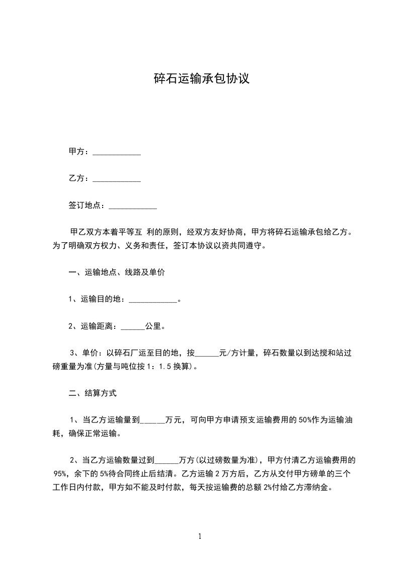 甲乙双方本着平等互 利的原则,经双方友好协商,甲方将碎石运输承包给乙方。为了明确双方权力、义务和责任,签订本协议以资共同遵守。