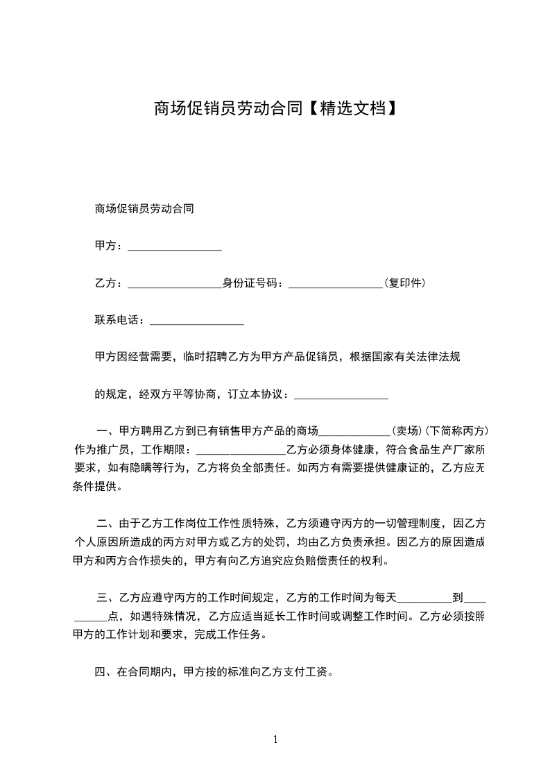 一、甲方聘用乙方到已有销售甲方产品的商场 _________(卖场)(下简称丙方)作为推广员,工作期限:__________________________________ 乙方必须身体健康,符合食品生产厂家所要求,如有隐瞒等行为,乙方将负全部责任。如丙方有需要提供健康证的,乙方应无条件提供。