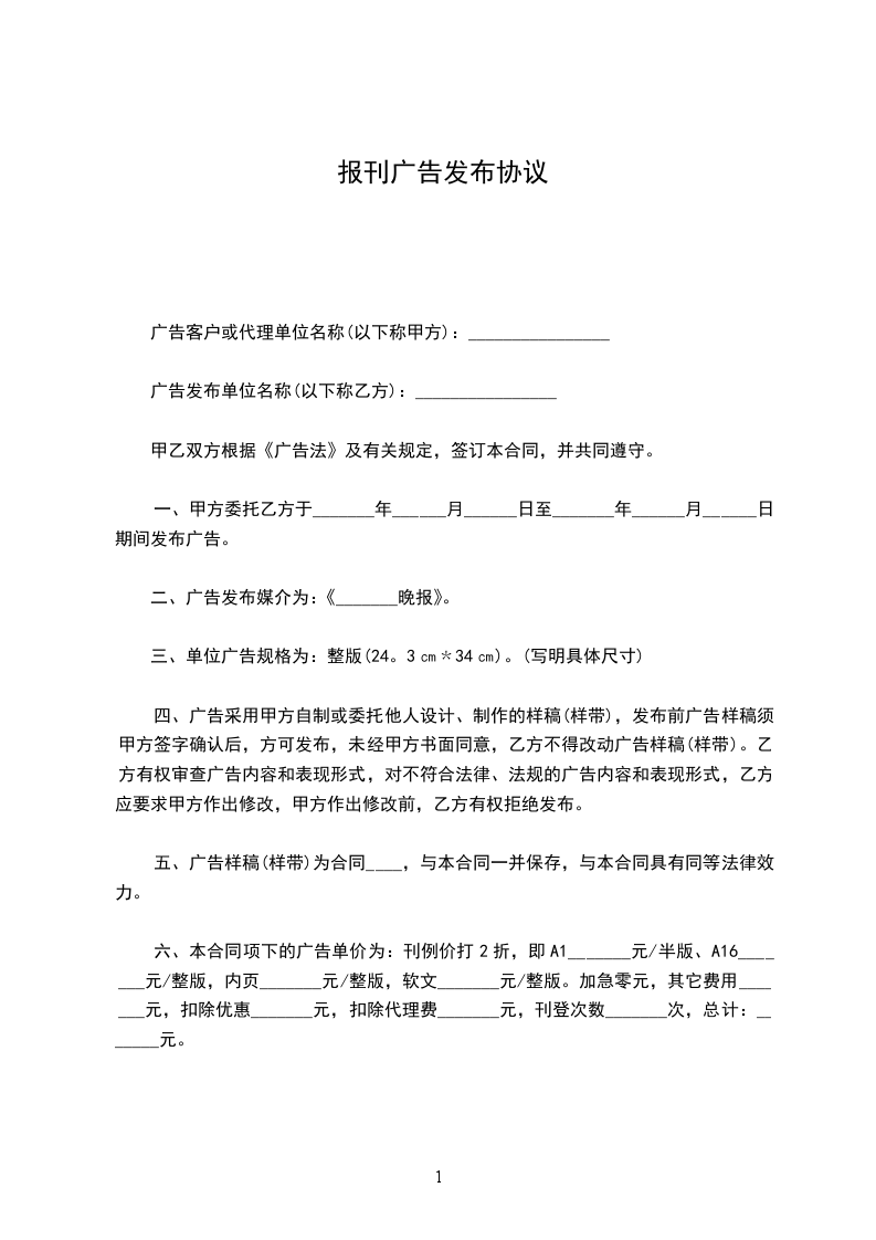 六、本合同项下的广告单价为:刊例价打2折,即A1_______元/半版、A16_______元/整版,内页_______元/整版,软文_______元/整版。加急零元,其它费用_______元,扣除优惠_______元,扣除代理费_______元,刊登次数_______次,总计:_______元。