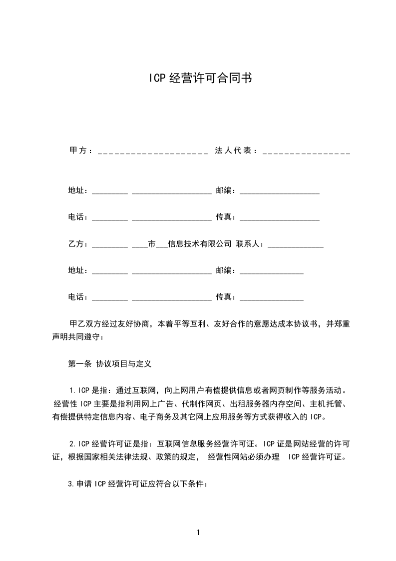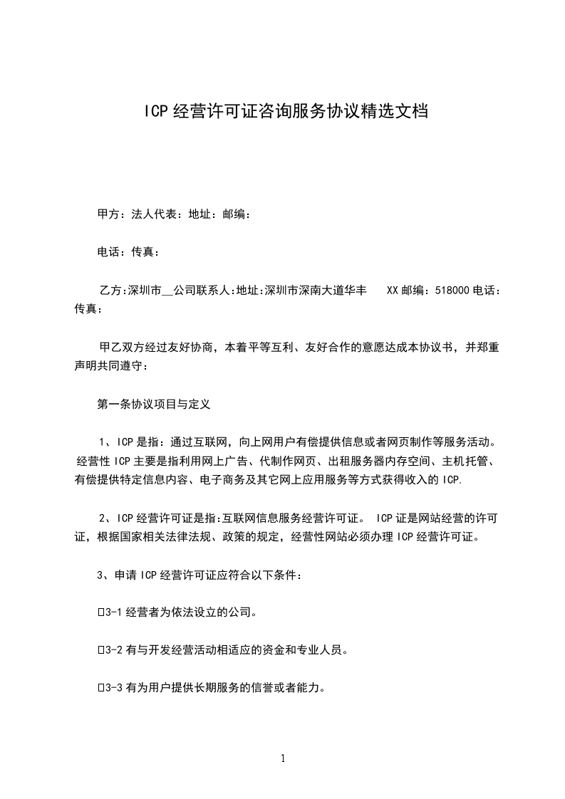 1.根据本协议附属文件约定的范围,为甲方办理ICP经营许可证提供相关服务和/或咨询。具体服务内容为: