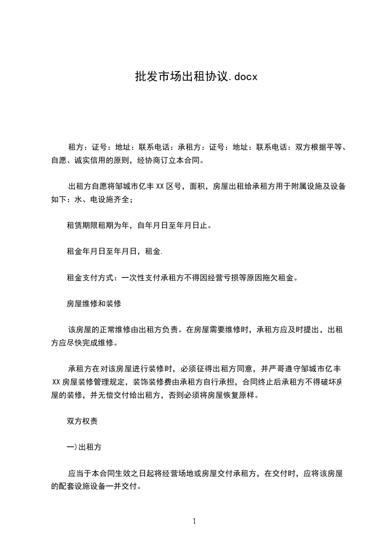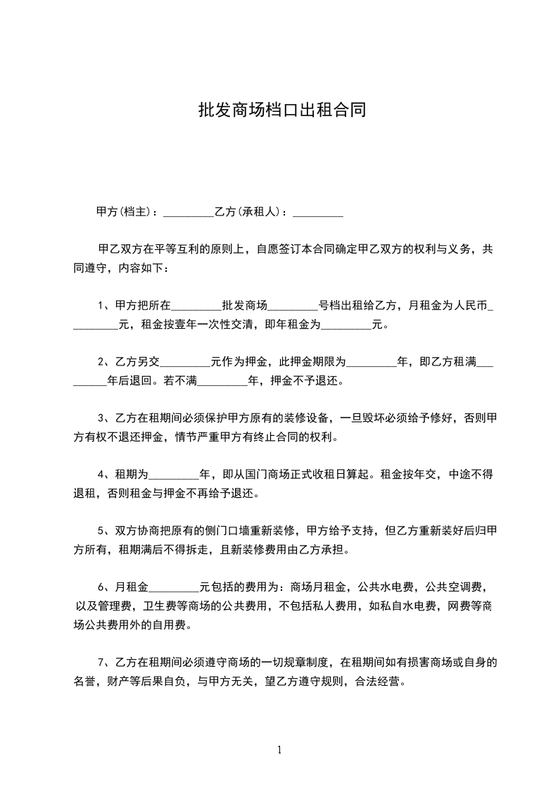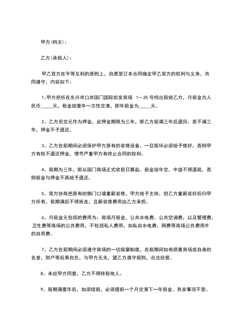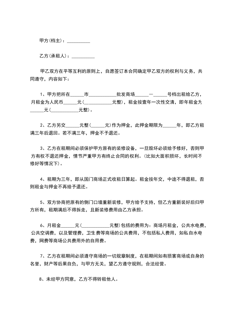 1、甲方把所在_________批发商场_________号档出租给乙方,月租金为人民币_________元,租金按壹年一次性交清,即年租金为_________元。