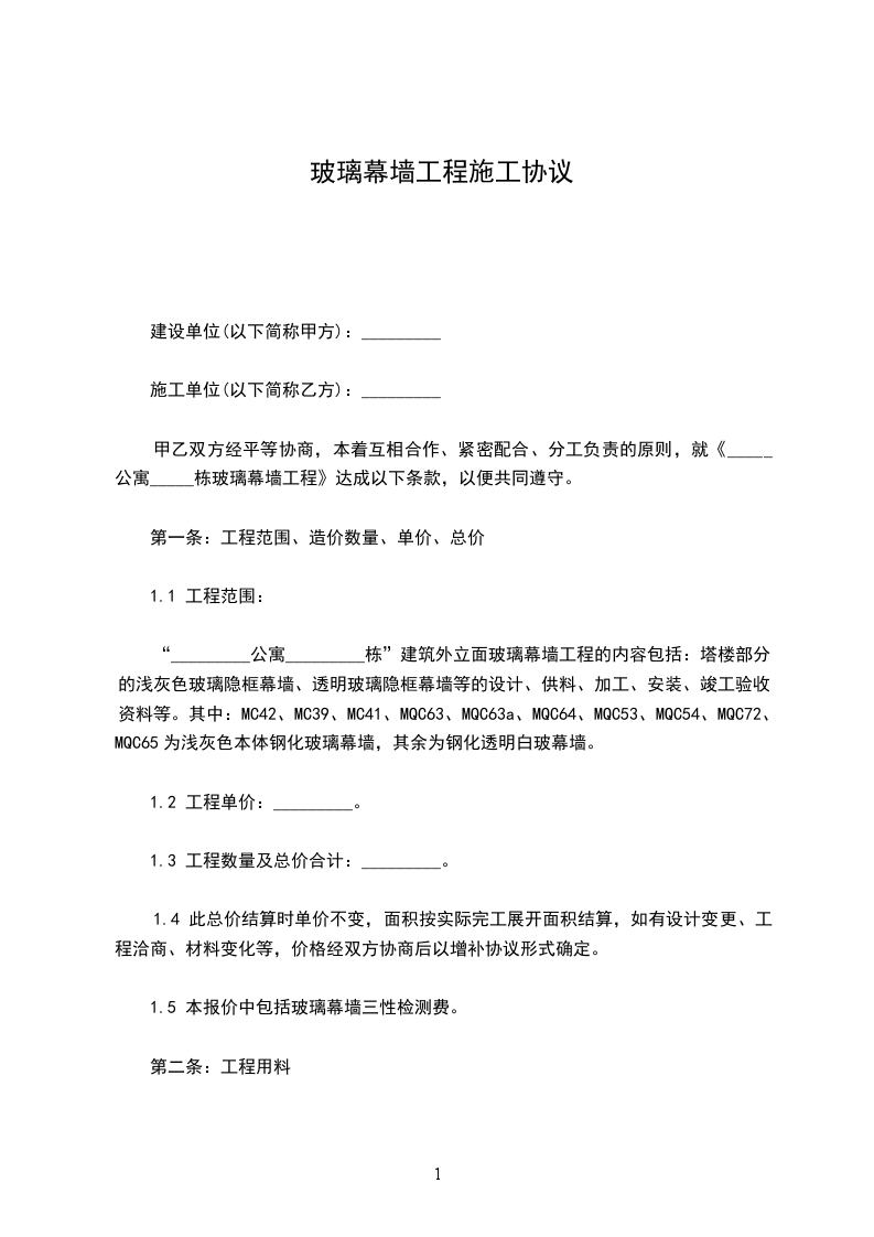 甲乙双方经平等协商,本着互相合作、紧密配合、分工负责的原则,就《_____公寓_____栋玻璃幕墙工程》达成以下条款,以便共同遵守。