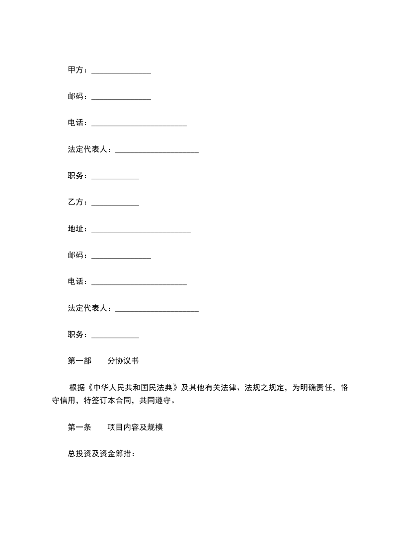 总投资____万元(其中:征地费____万元,开发费____万元,建筑安装费____万元)。投入资金规模____万元,甲方出资____万元,分____次出资,每次出资____万元,预收款____万元;乙方出资____万元,分____次出资,每次出资____万元。