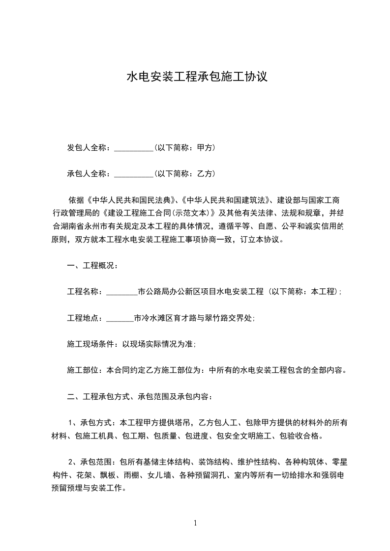 依据《中华人民共和国民法典》、《中华人民共和国建筑法》、建设部与国家工商行政管理局的《建设工程施工合同(示范文本)》及其他有关法律、法规和规章,并结合湖南省永州市有关规定及本工程的具体情况,遵循平等、自愿、公平和诚实信用的原则,双方就本工程水电安装工程施工事项协商一致,订立本协议。