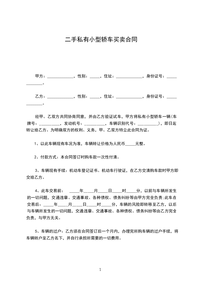 经甲、乙双方共同协商同意,并由乙方验证试车,甲方将私有小型轿车一辆(车牌号:__________,发动机号:__________,车辆识别代号:__________),即日起转让给乙方。为明确双方的权利、义务,甲、乙双方特立此合同为证。