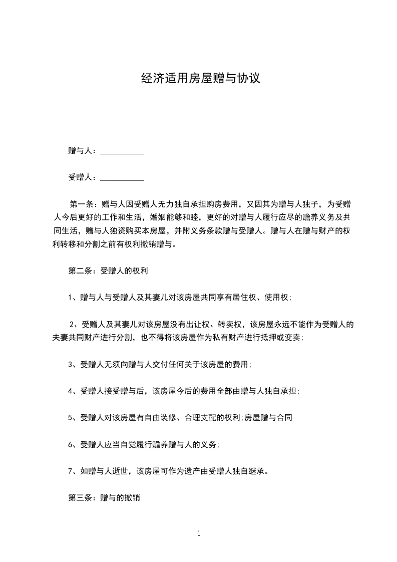 第一条:赠与人因受赠人无力独自承担购房费用,又因其为赠与人独子,为受赠人今后更好的工作和生活,婚姻能够和睦,更好的对赠与人履行应尽的赡养义务及共同生活,赠与人独资购买本房屋,并附义务条款赠与受赠人。赠与人在赠与财产的权利转移和分割之前有权利撤销赠与。