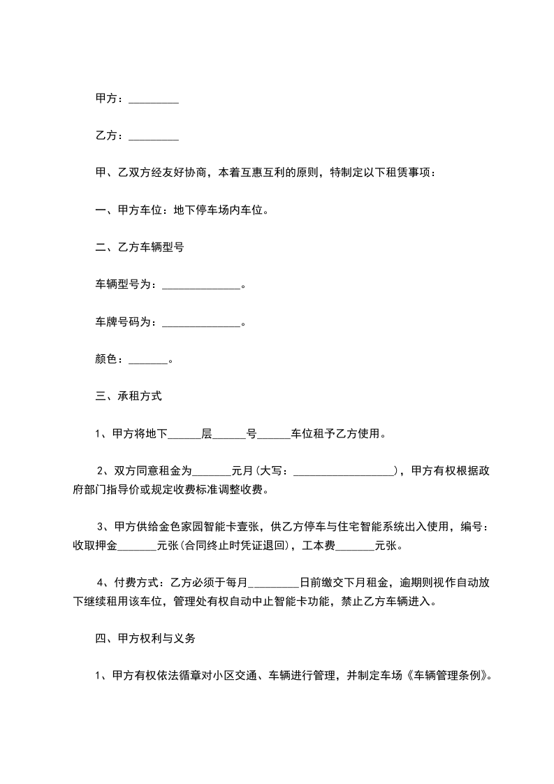 4、付费方式:乙方必须于每月_________日前缴交下月租金,逾期则视作自动放下继续租用该车位,管理处有权自动中止智能卡功能,禁止乙方车辆进入。