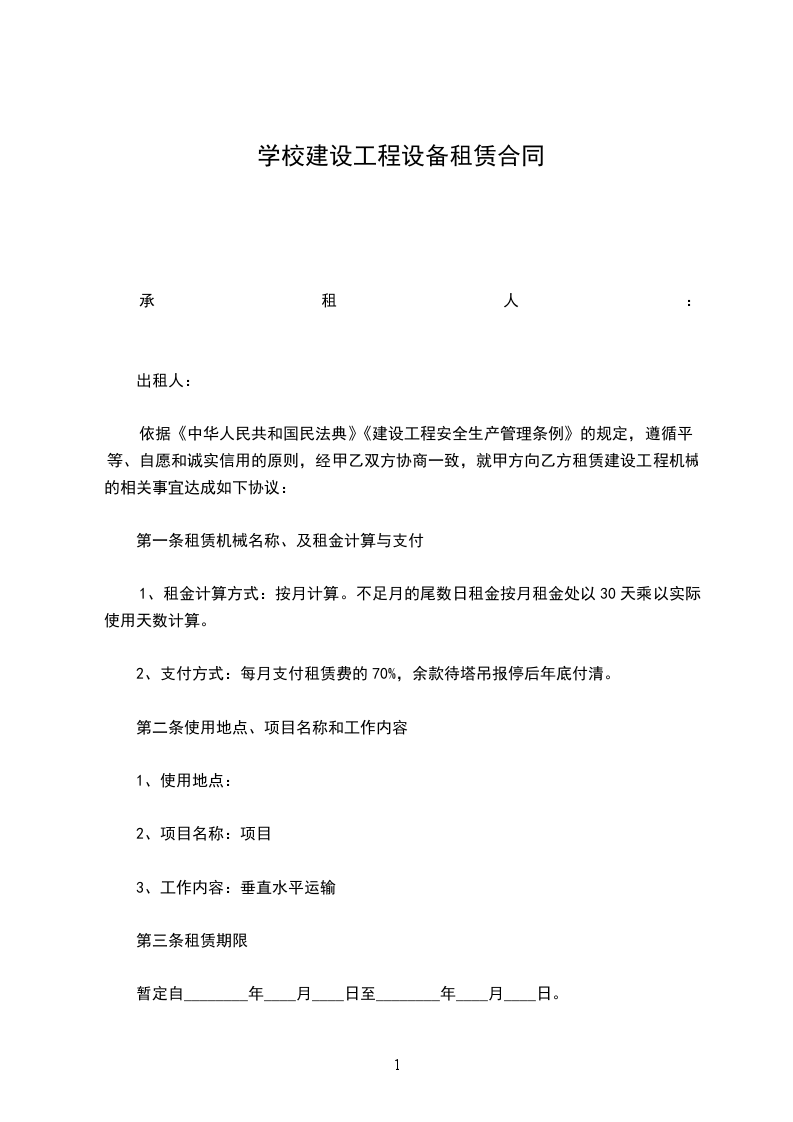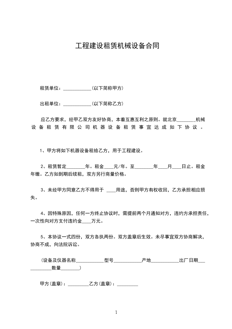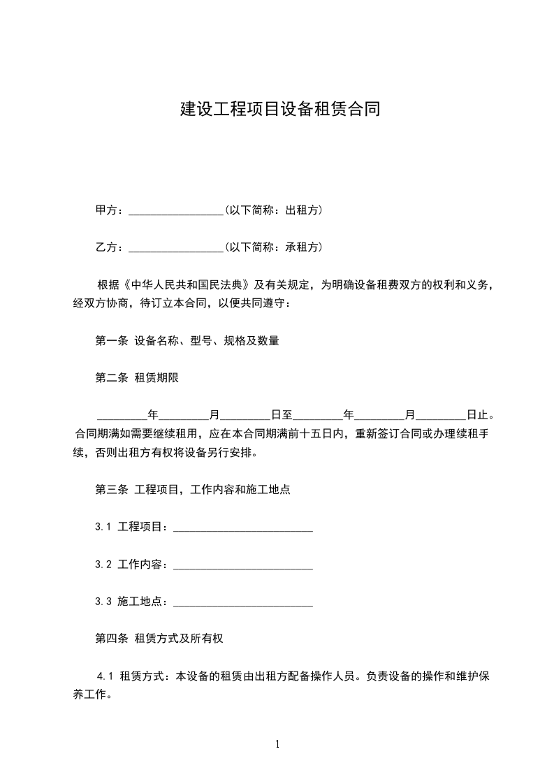乙方因工程需要,租用甲方施工设备。为明确双方职责、权利和义务,依据《中华人民共和国民法典》有关条款,经双方协商,订立本合同,以共同遵守。