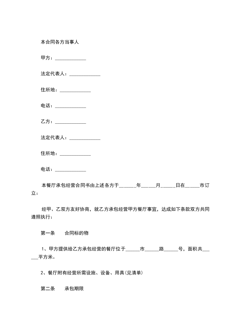 1、甲方提供给乙方承包经营的餐厅位于______市______路______号,面积共______平方米。