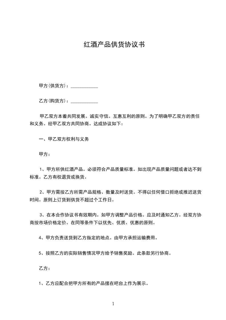 1、甲方所供红酒产品。必须符合产品质量标准。如出现产品质量问题或者达不到标准。乙方有权退货或换货。