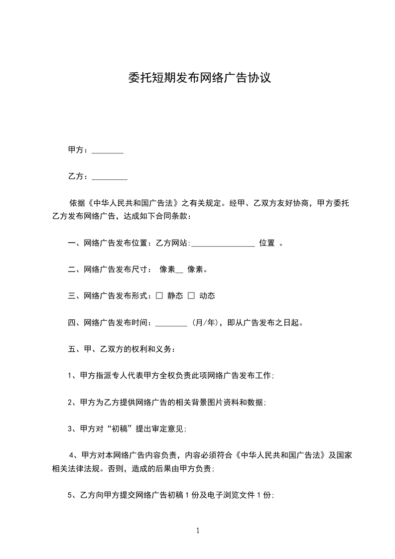 依据《中华人民共和国广告法》之有关规定。经甲、乙双方友好协商,甲方委托乙方发布网络广告,达成如下合同条款: