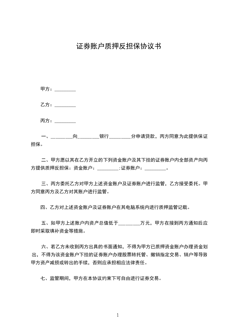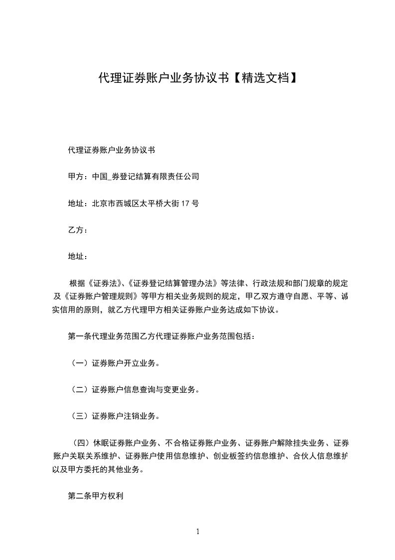 一、乙方委托甲方代理操作乙方在_________(证券营业部)开设的资金账户,资金账号为_________ 。交易密码甲乙双方共享,乙方可以查询,但不能操作。