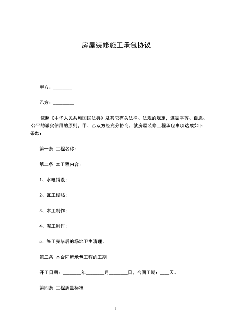 依照《中华人民共和国民法典》及其它有关法律、法规的规定,遵循平等、自愿、公平的诚实信用的原则,甲、乙双方经充分协商,就房屋装修工程承包事项达成如下条款: