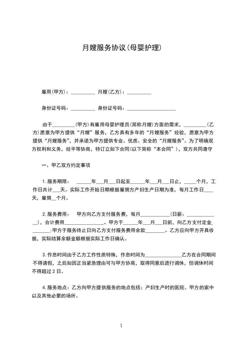 由于_________(甲方)有雇用母婴护理员(简称月嫂)方面的需求,_________(乙方)愿意为甲方提供“月嫂”服务,乙方具有多年的“月嫂服务”经验,愿意为甲方提供“月嫂服务”,并承诺为甲方提供专业、优质、安全的“月嫂服务”。为了明确双方权利和义务,经平等协商,特订立如下合同(以下简称“本合同”),双方共同遵守: