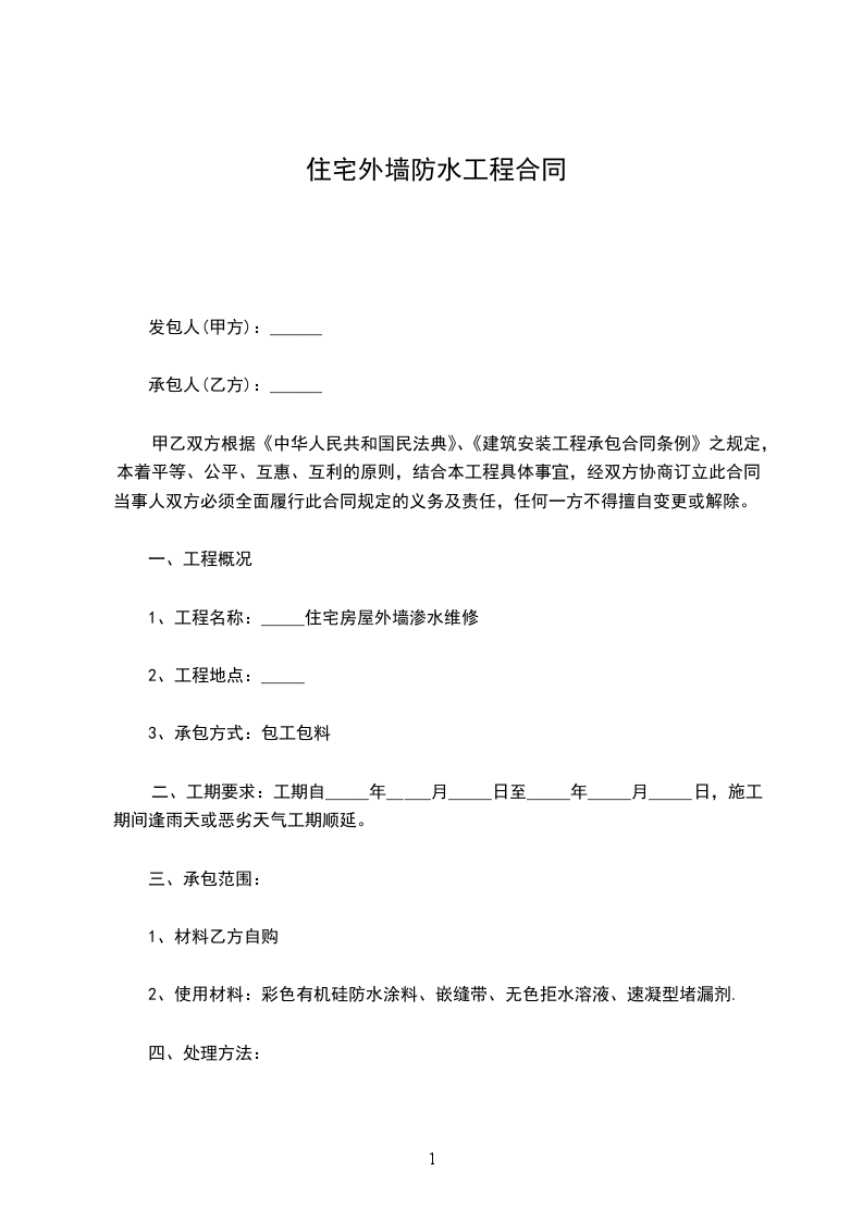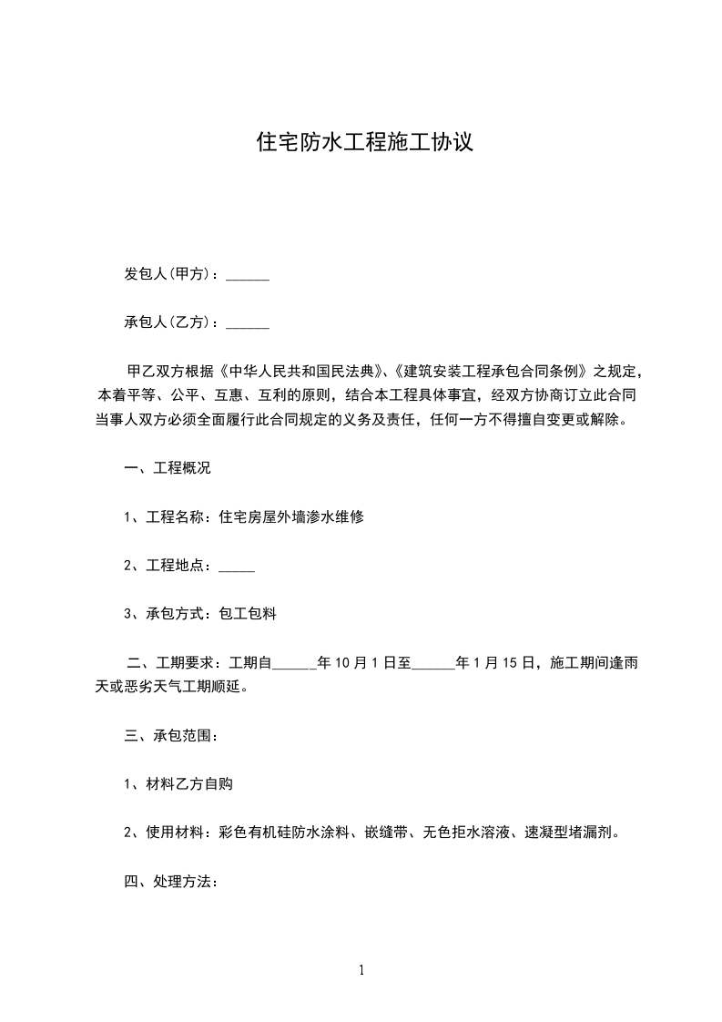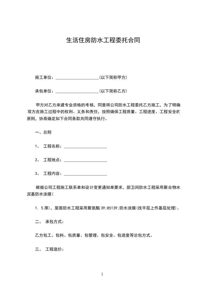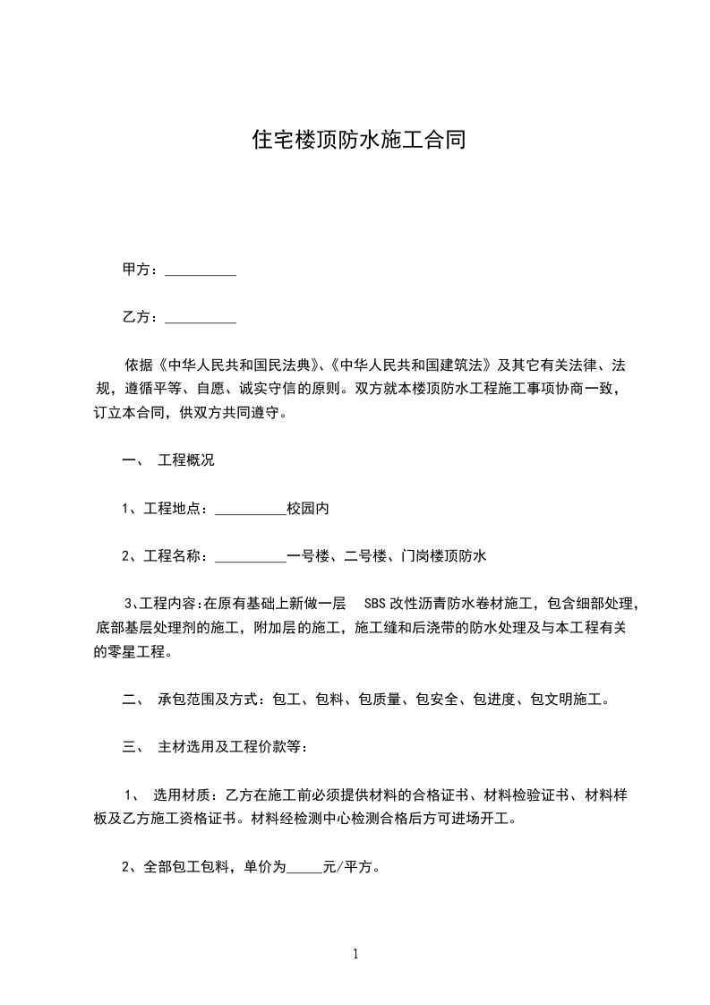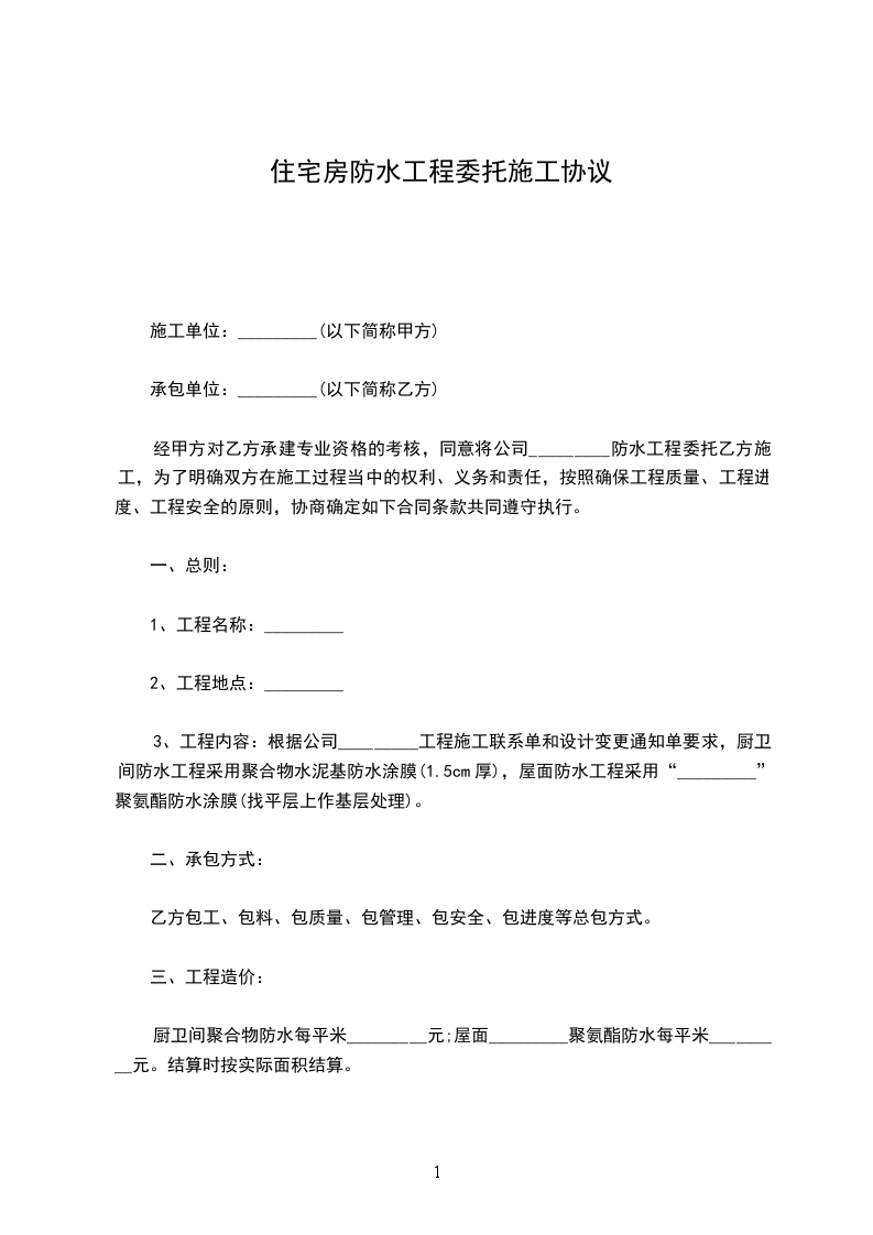 厨卫间聚合物防水每平米_________元;屋面_________聚氨酯防水每平米_________元。结算时按实际面积结算。