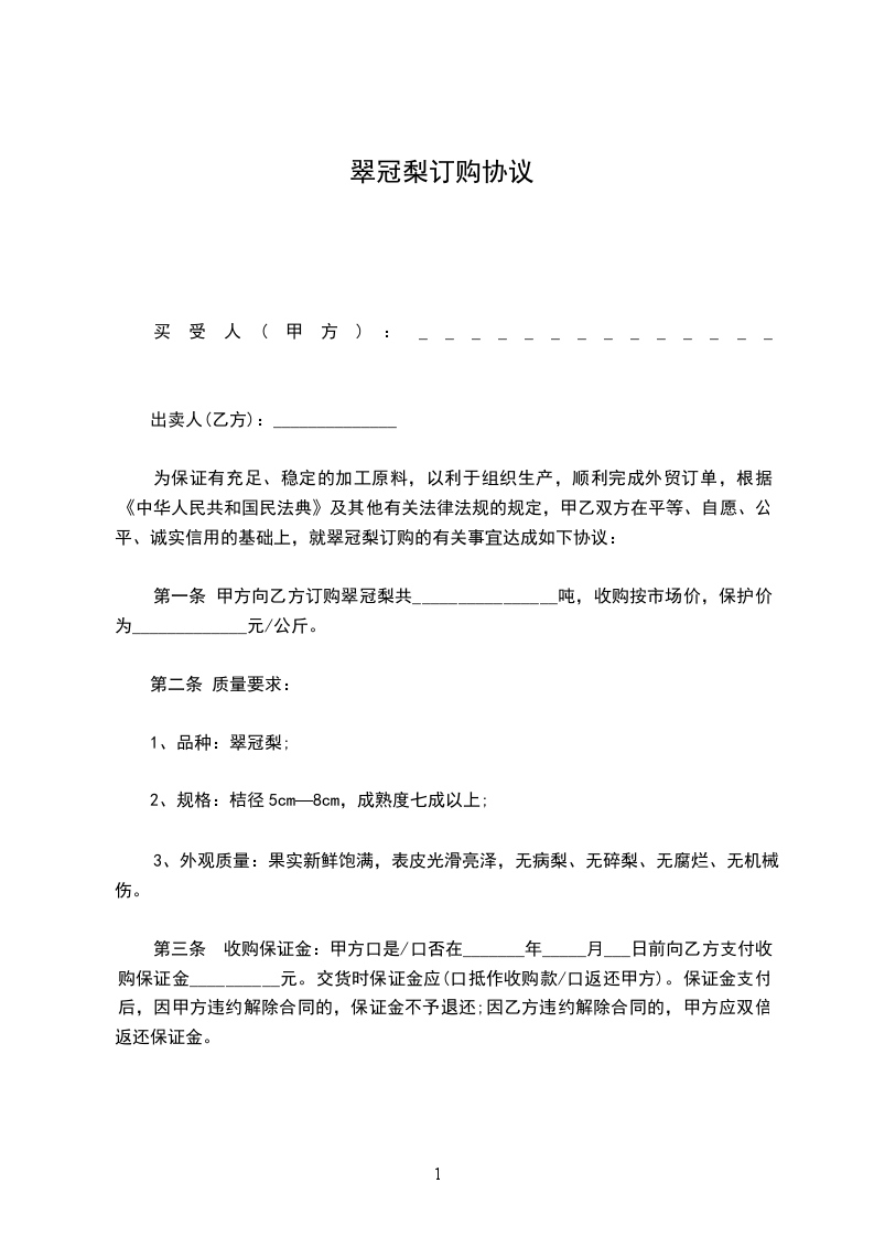 第一条 甲方向乙方订购翠冠梨共________________吨,收购按市场价,保护价为_____________元/公斤。