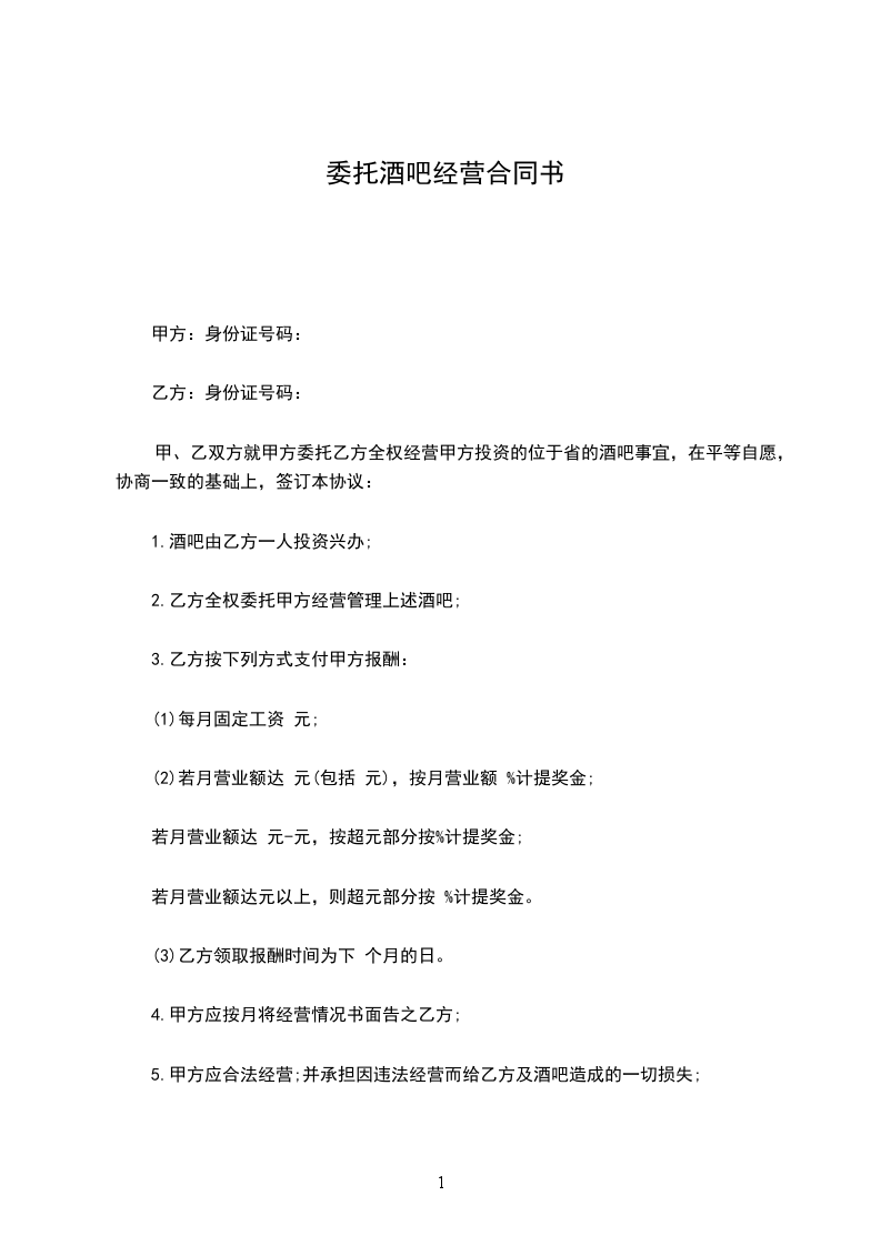 甲、乙双方就甲方委托乙方全权经营甲方投资的位于___________省的___________酒吧事宜,在平等自愿,协商一致的基础上,签订本协议: