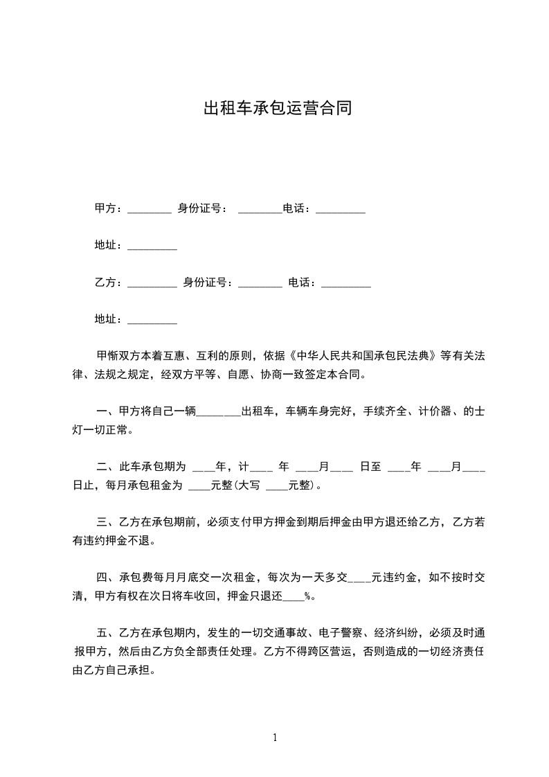 五、乙方在承包期内,发生的一切交通事故、电子警察、经济纠纷,必须及时通报甲方,然后由乙方负全部责任处理。乙方不得跨区营运,否则造成的一切经济责任由乙方自己承担。