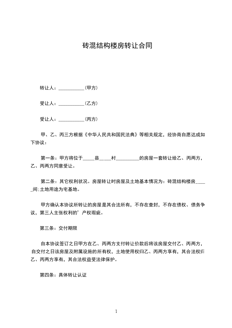 第一条:甲方将位于_____县_____村__________的房屋一套转让给乙、丙两方,乙、丙两方同意受让。