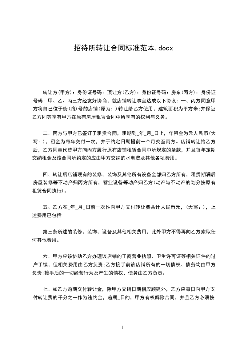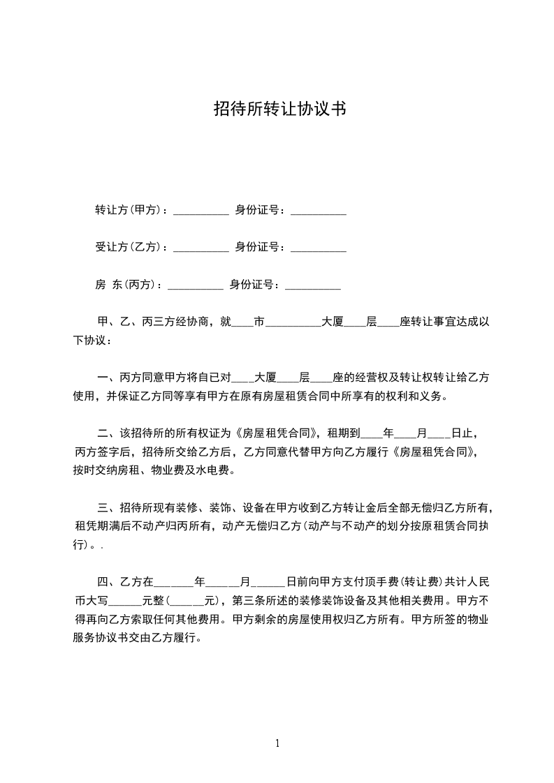二、该招待所的所有权证为《房屋租赁合同》,租期到____年____月____日止,丙方签字后,招待所交给乙方后,乙方同意代替甲方向乙方履行《房屋租赁合同》,按时交纳房租、物业费及水电费。