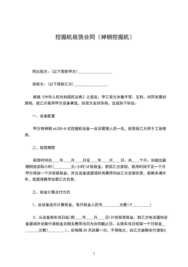 甲方将神钢sk200-8式挖掘机设备一台及管理人员一名,租赁给乙方用于工地使用。