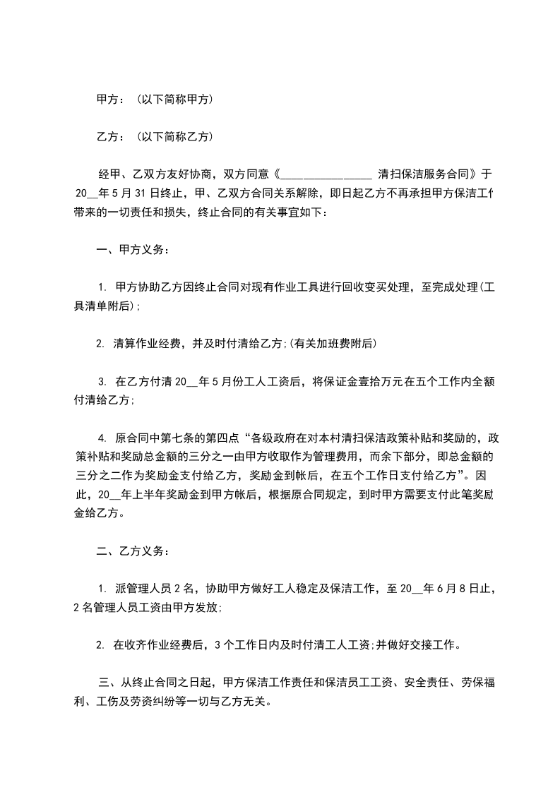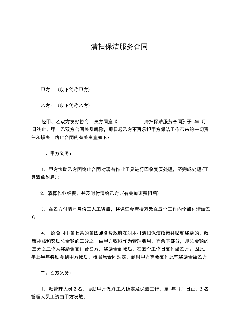 1、甲方对乙方保洁员的服务质量不满意时,有权向乙方提出更换保洁员的要求,若连续3次不满意,甲方有权解除本合同。