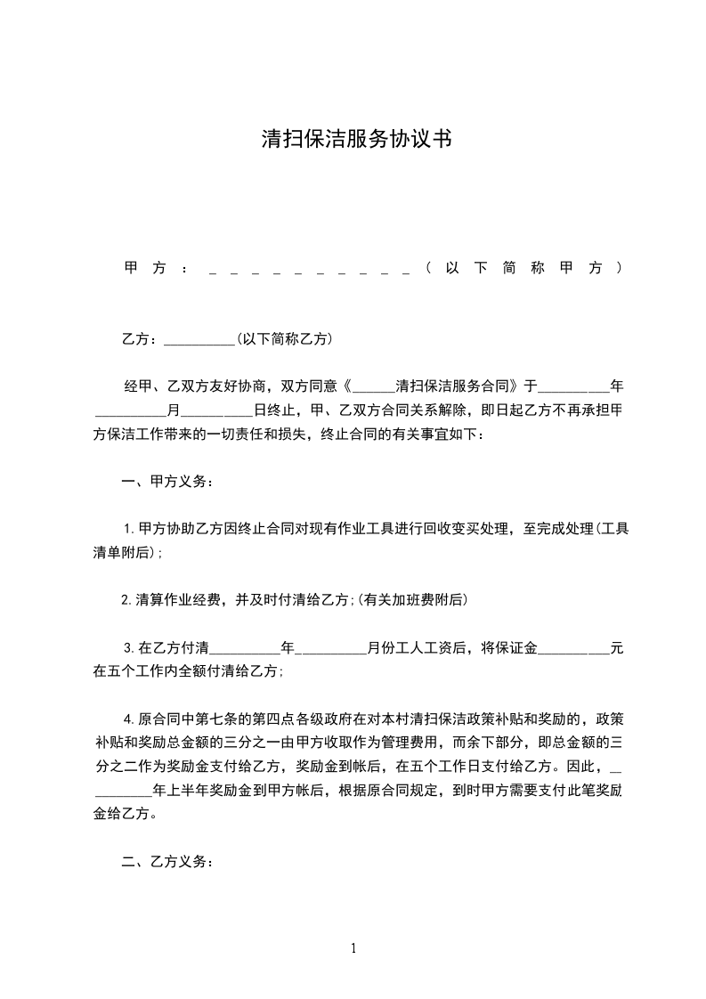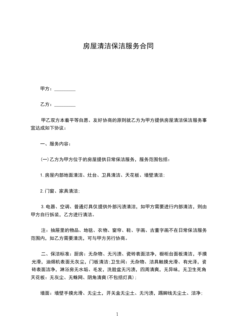 甲乙双方本着平等自愿、友好协商的原则就乙方为甲方提供房屋清洁保洁服务事宜达成如下协议: