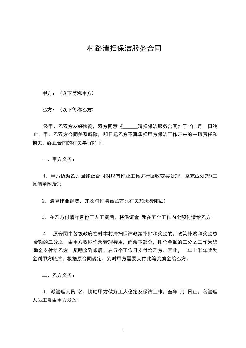 1、甲乙双方约定每周、午为清洁服务时间,甲方如有临时变更服务时间的要求,应提前一天通知乙方,以便乙方工作安排。